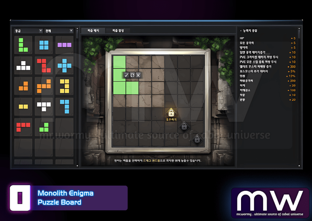 In this feature, adventurers can collect puzzle pieces through dungeons and various gameplay activities. Each piece offers a random stat boost based on its shape and grade. By placing these pieces on your puzzle board, youāll unlock new abilities and shape your characterās growth path.