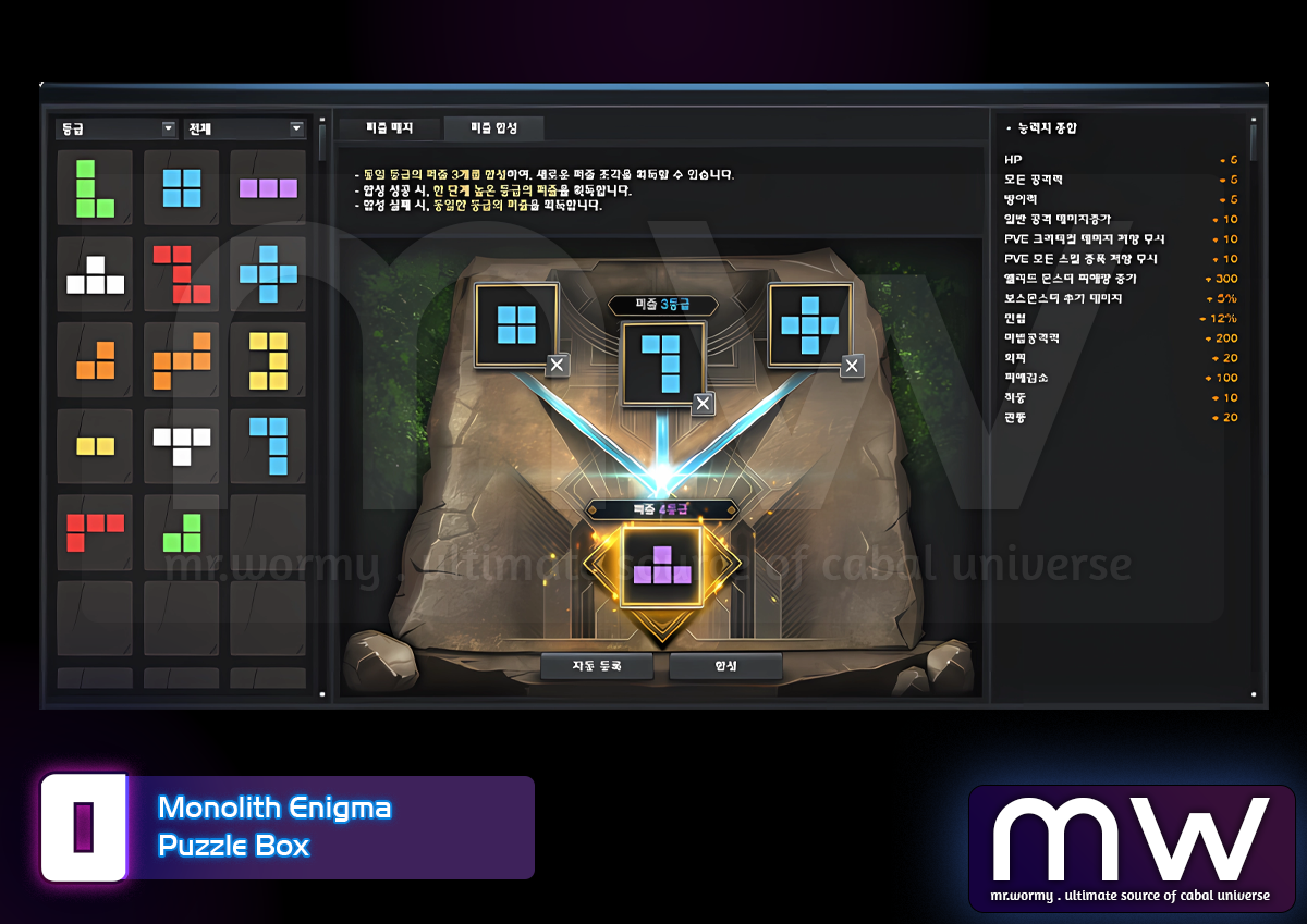 In this feature, adventurers can collect puzzle pieces through dungeons and various gameplay activities. Each piece offers a random stat boost based on its shape and grade. By placing these pieces on your puzzle board, youāll unlock new abilities and shape your characterās growth path.