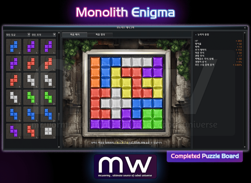 - Monolith Enigma is a growth content that gives character’s stats by arranging puzzle pieces of various shapes and grades on the puzzle board.