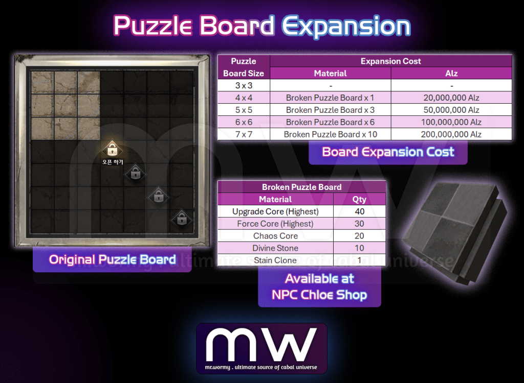 - Board can be expanded up to size of 7×7, using “Broken Puzzle Board” and Alz.