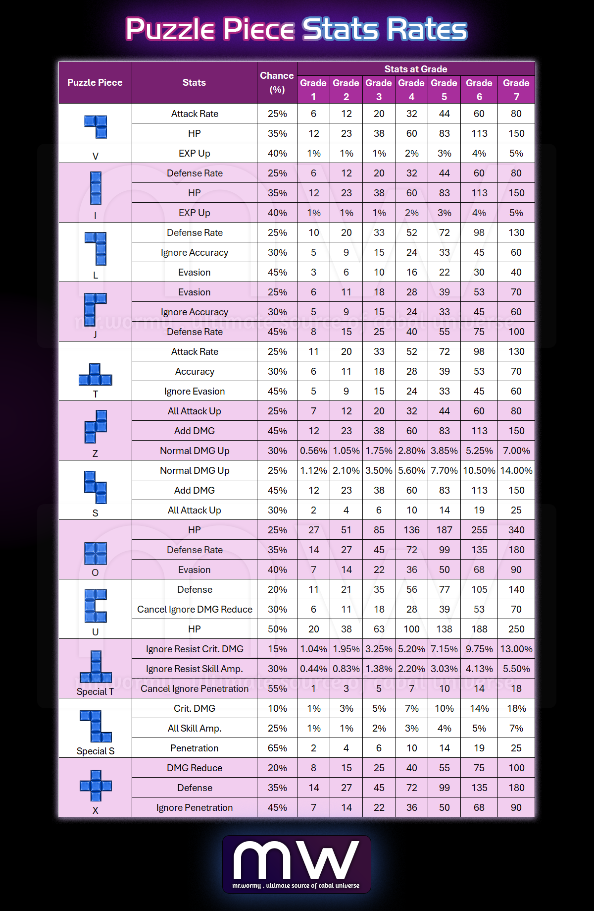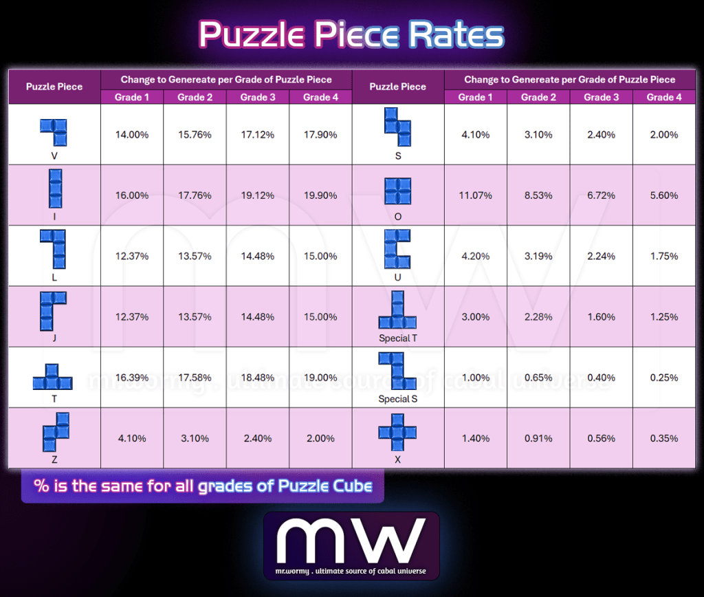 - Puzzle Piece Grade 1 – 4 can be obtained from Puzzle Cube.