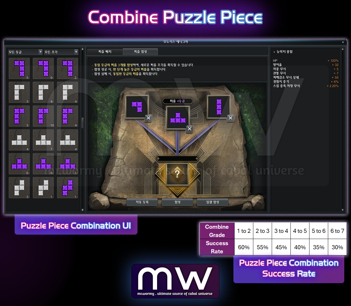 - Player can combine Puzzle Pieces of the same grade for a chance to get higher grade.