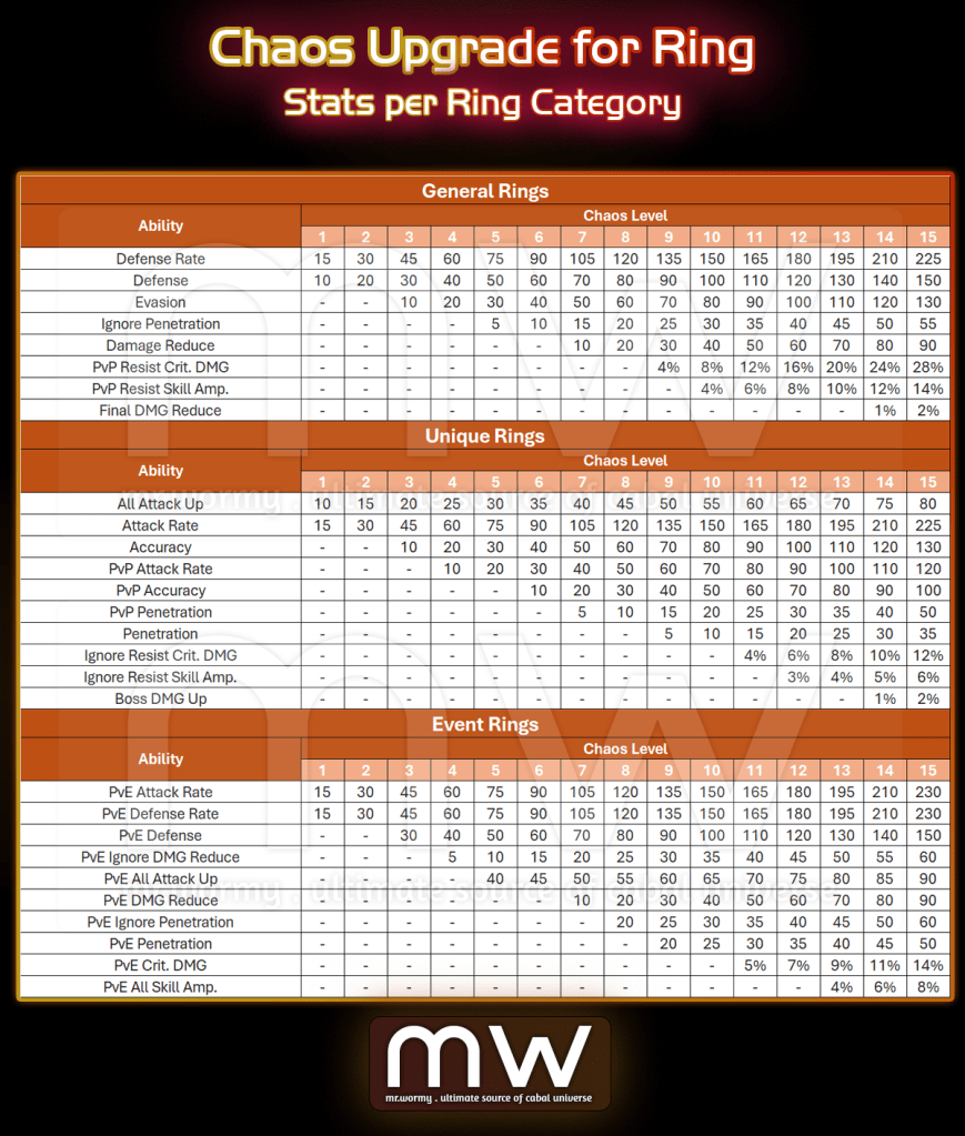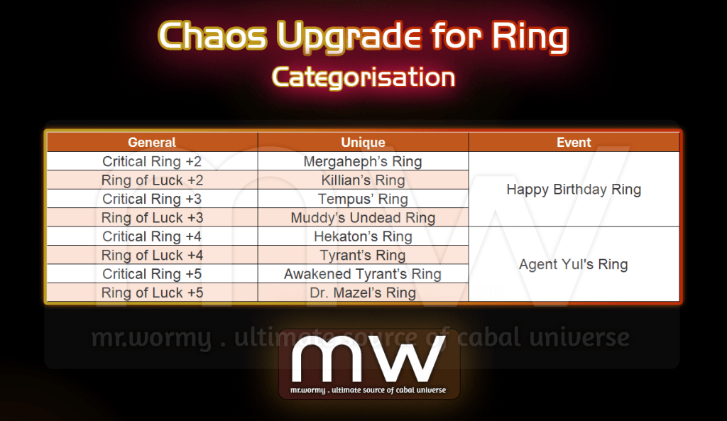- A Chaos Upgrade Seal Stone of Critical Ring +5 cannot be applied on Dr. Mazel’s Ring, because one is General Ring and another is Unique Ring.