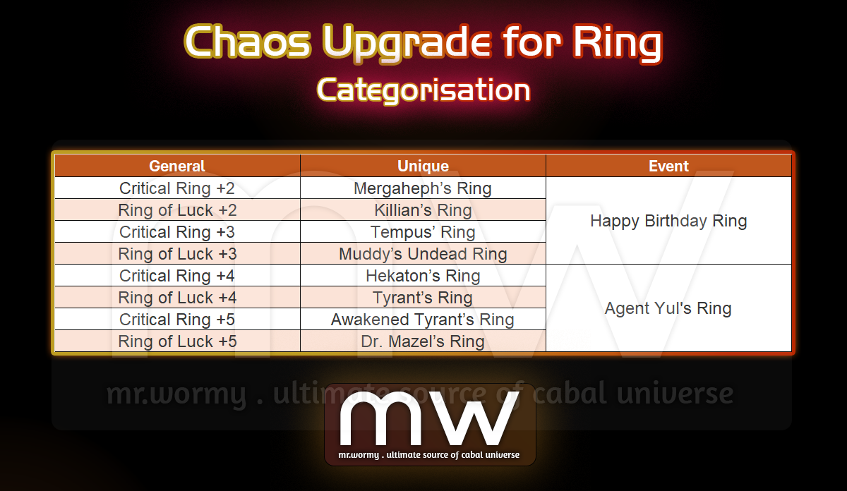 - A Chaos Upgrade Seal Stone of Critical Ring +5 cannot be applied on Dr. Mazel’s Ring, because one is General Ring and another is Unique Ring.
