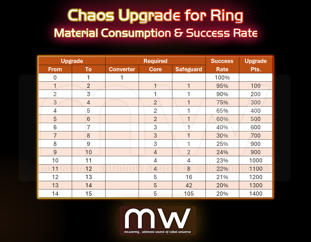 - Different amount of Chaos Core and success rate depends on upgrade grade.
