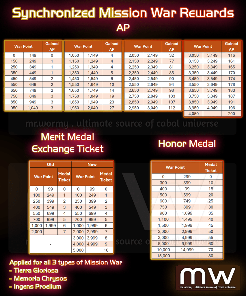 - Changes the rewards for Mission War based on War Point ranges and synchronized the rewards of all Mission War maps to be the same: