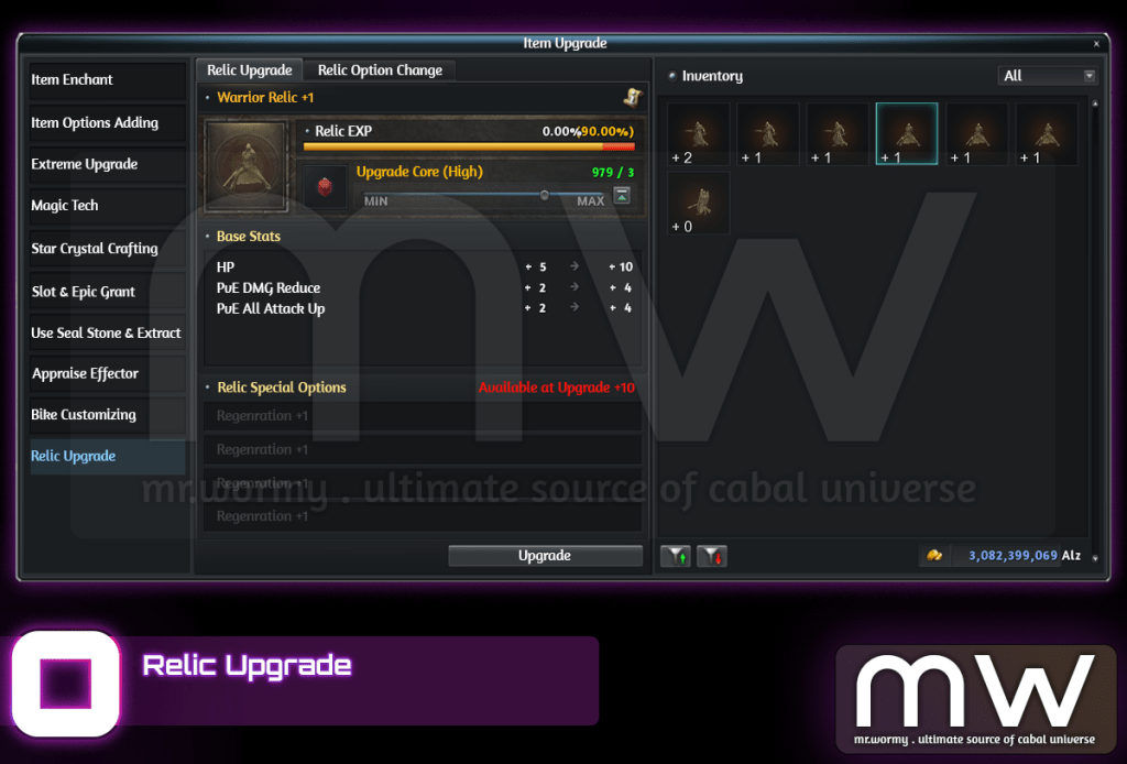 - Using Upgrade Core to upgrade Relic Basic Options to Lv. 10