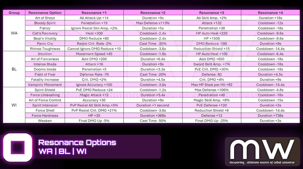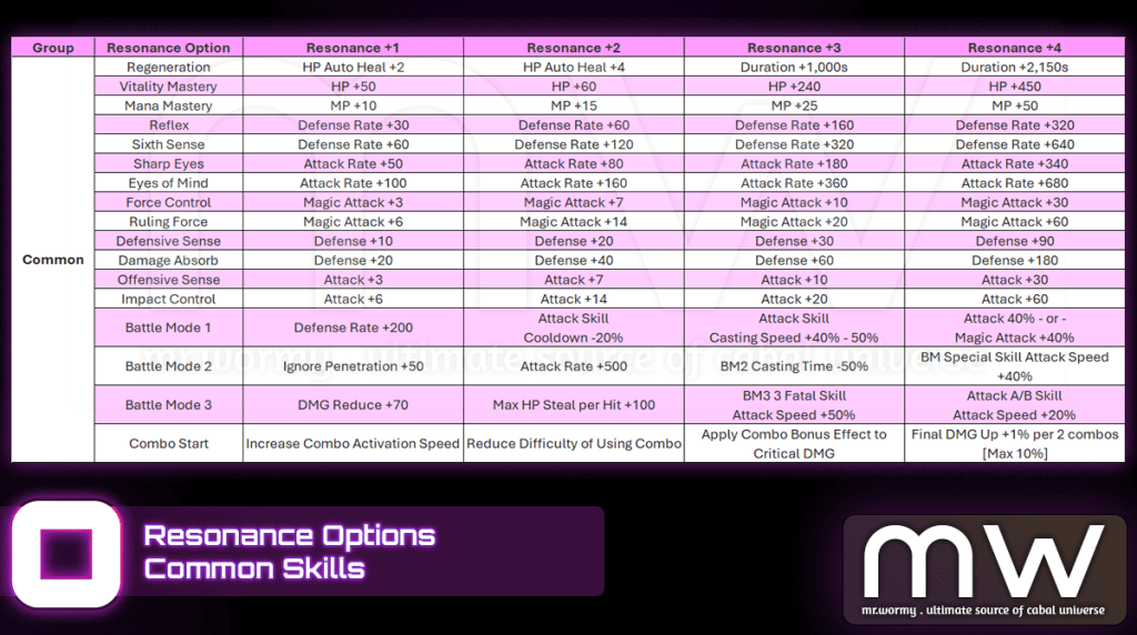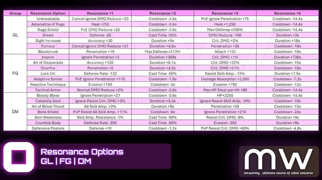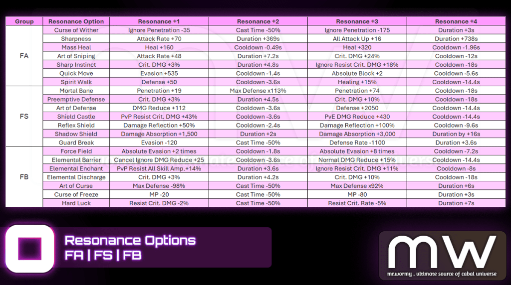 - If there is any duplicated option among 4 Resonance Option, that option will be additionally enhanced, refer to the Resonance Option below.