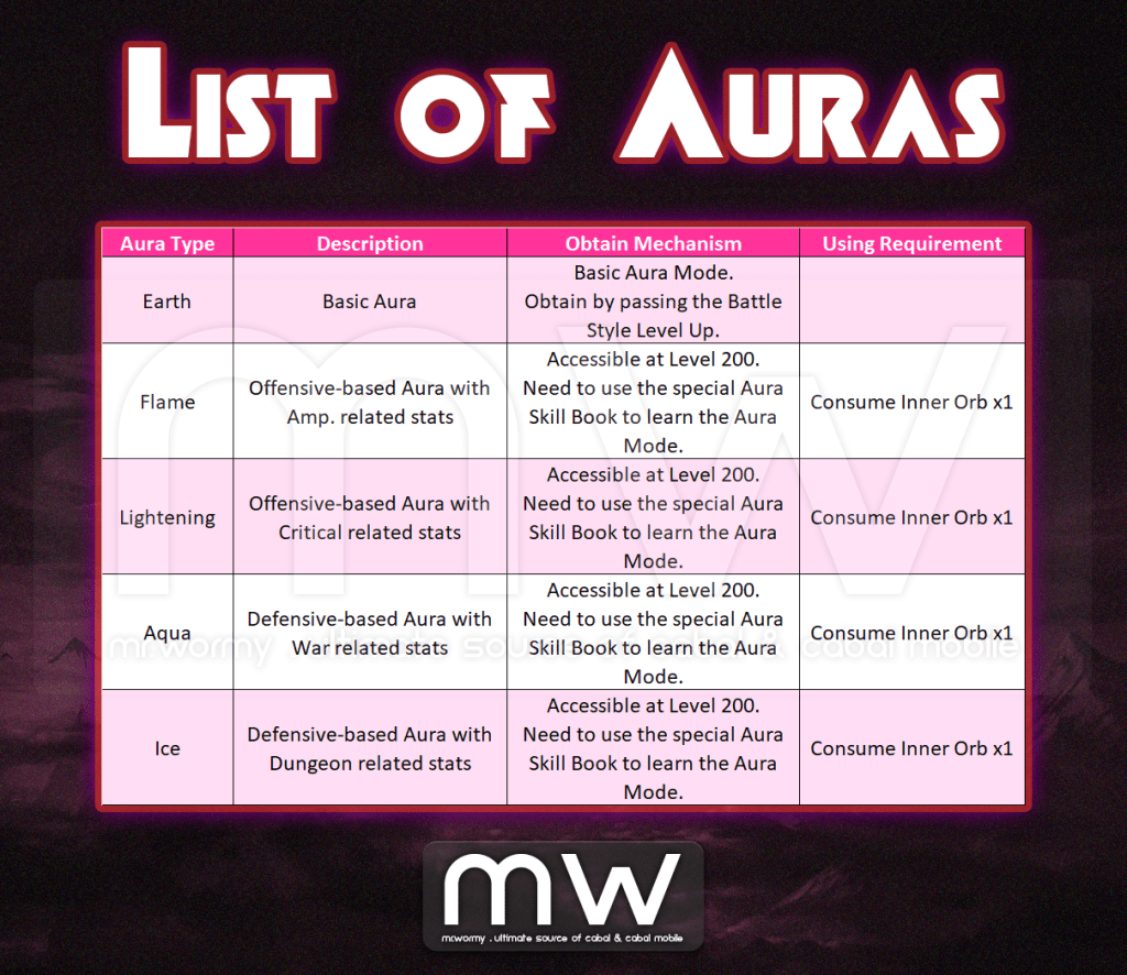- Stats of each Aura Mode are unique and designed for specific situation:
