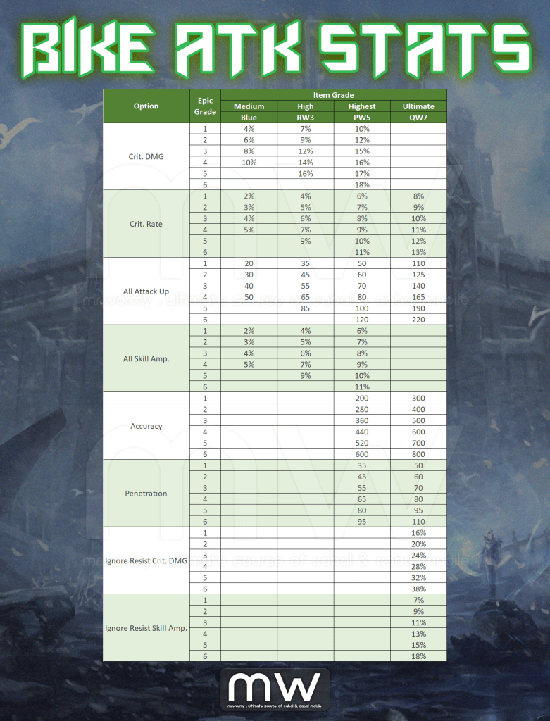- This page is focusing on the Epic for Weapon, Armour and Bike only with the available stats, way for boosting the Epic. For costumes, there will be another page.