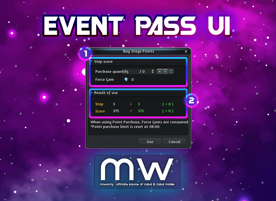 - When player clicks on the button at pay-to-upgrade area [6], a small UI will be displayed, here you can pay Force Gem to level up the Event Pass progress.