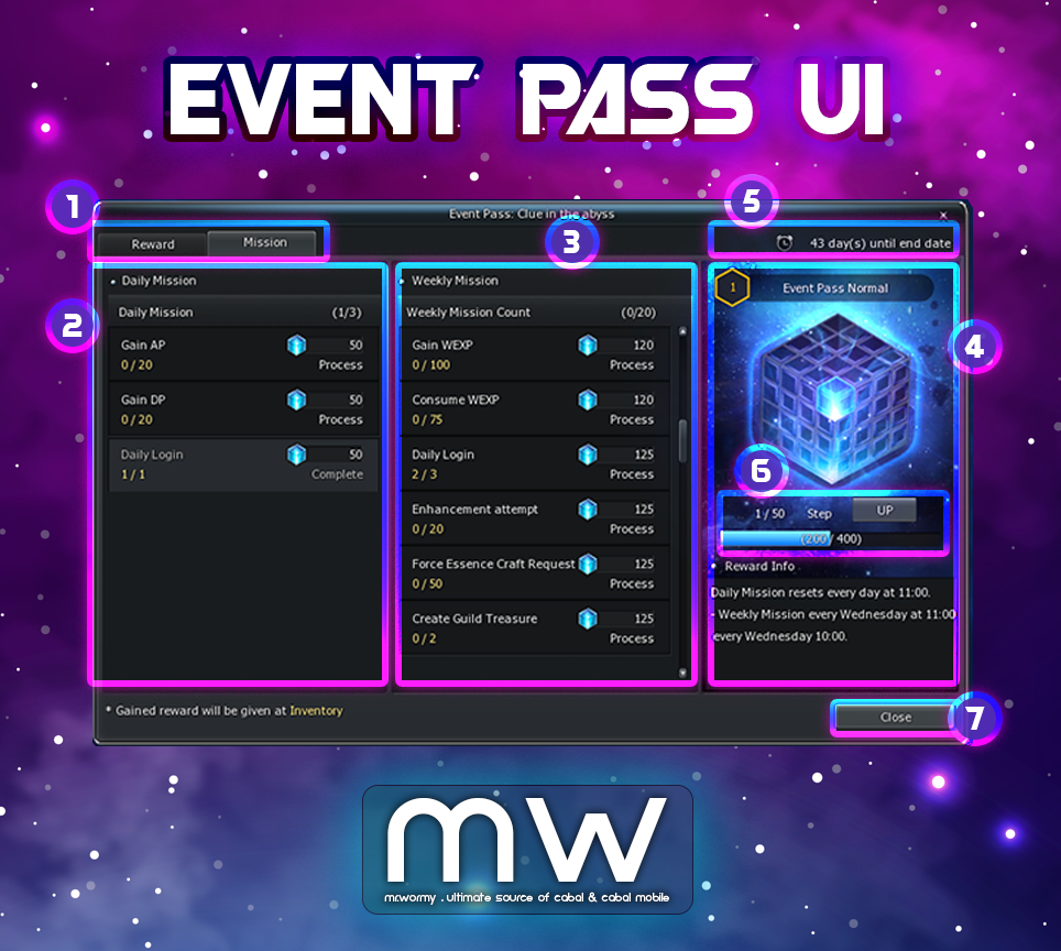 - Weekly Mission: Missions with different rewards, can be done within the week. Progress will be reset weekly*.