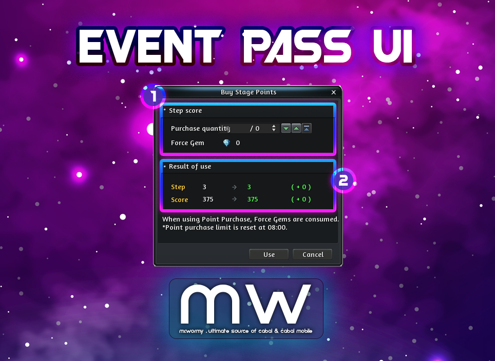- When player clicks on the button at pay-to-upgrade area [6], a small UI will be displayed, here you can pay Force Gem to level up the Event Pass progress.