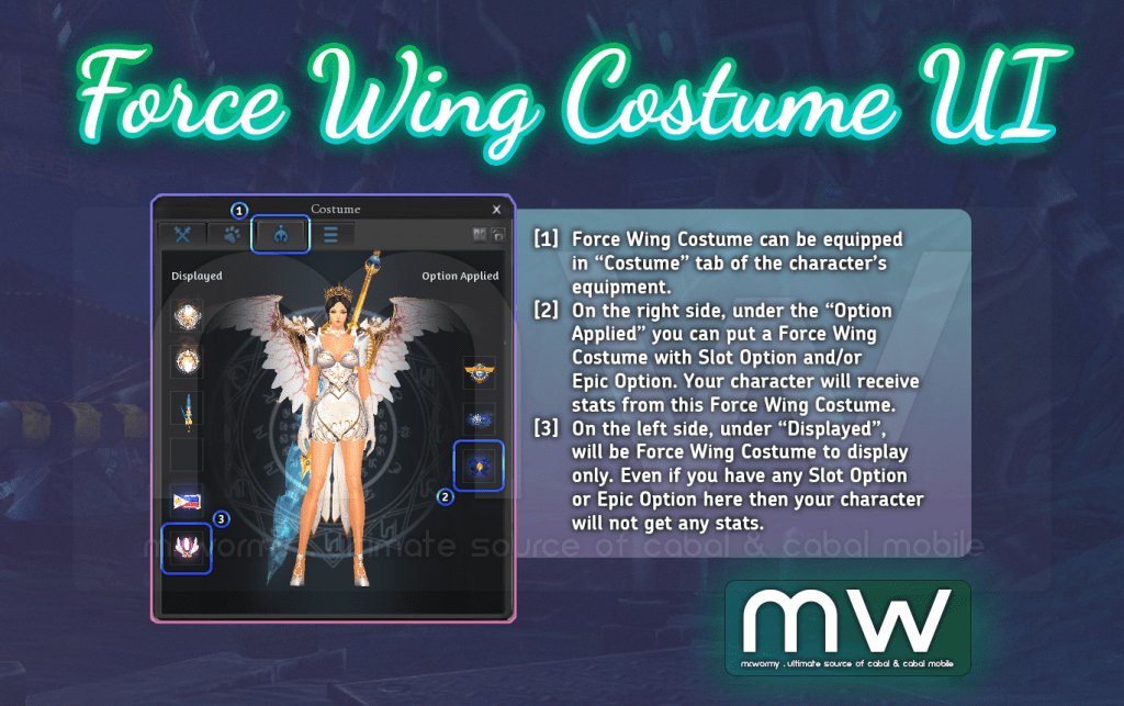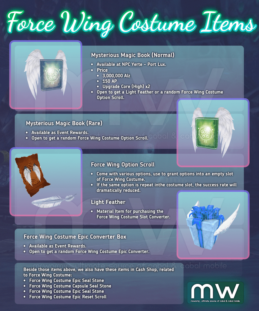- Force Wing Costume is cash-item that you can get from Cabal Cash Shop (or in some event, depends on publishers). Force Wing Costume is upgradeable in 2 ways by adding Slot Option or Epic Option. There is a handful amount of items were designed to support the Force Wing Costume.