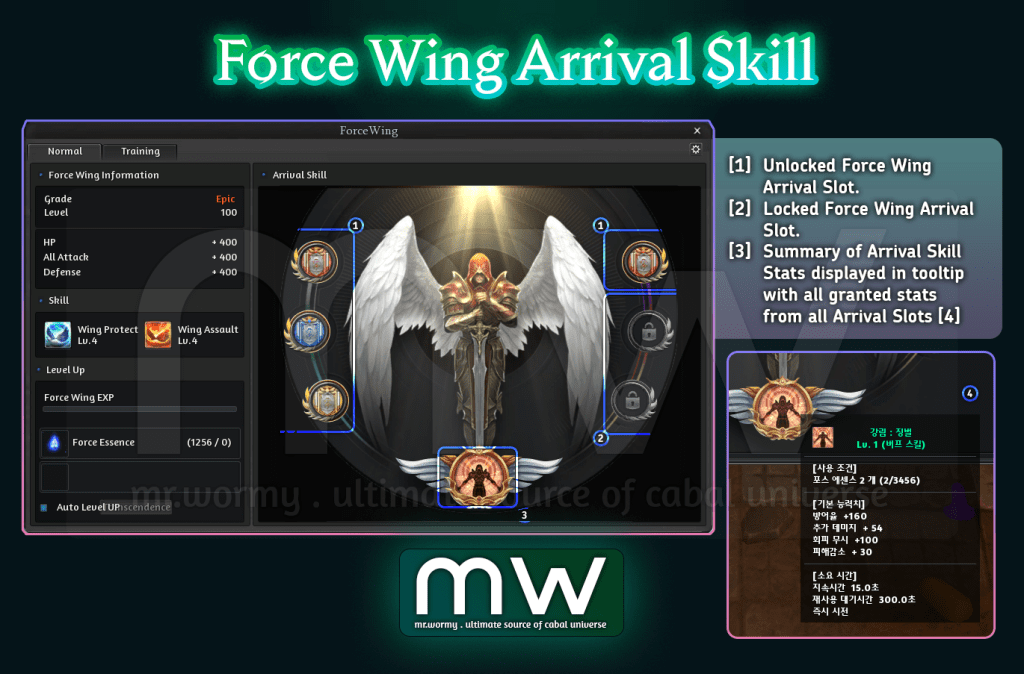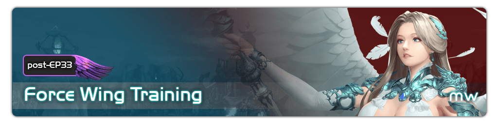 Force Wing was introduced from Episode 22 along with the introduction of Ultimate-grade items. Force Wing is considered as a game-changing factor, which provides a long-term grinding content for players with up to 600 levels were planned. Force Wing opens a whole new chapter for character-growing with many sub-contents such as Force Wing Training, Force Wing Transcendence, Force Wing Dungeon, Force Wing Costume, Force Wing Arrival Skill and more! This page will go through every single aspect of Force Wing eco-system.