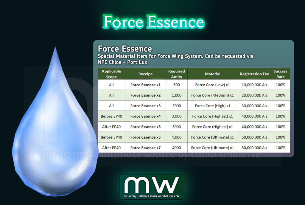 - Force Essence is a special material which is required in different processes of Force Wing. Force Essence can be requested via Chloe.