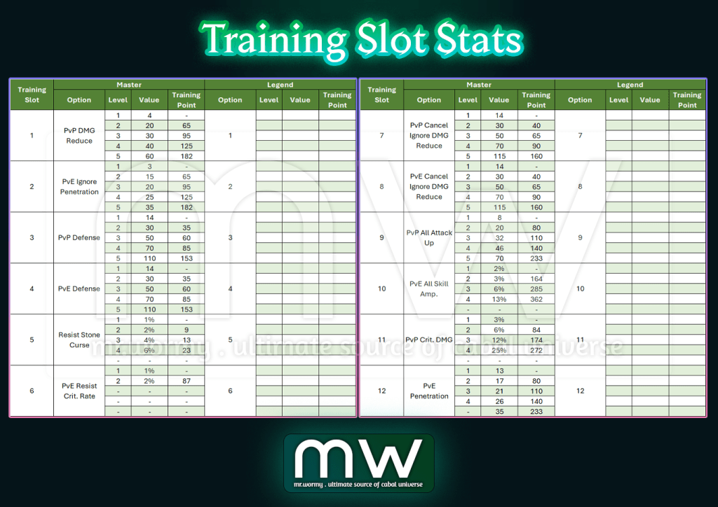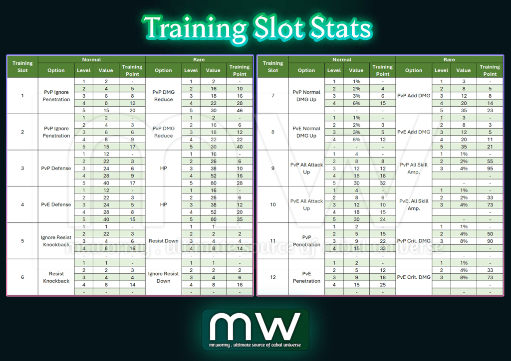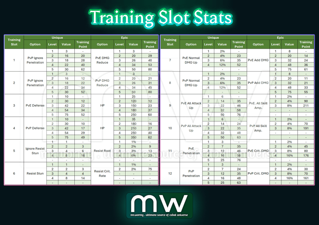 - Training Stats per Slots with value and required amount of Training Point: