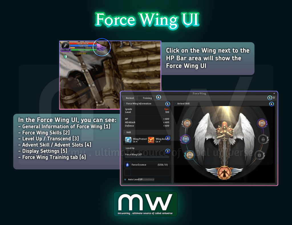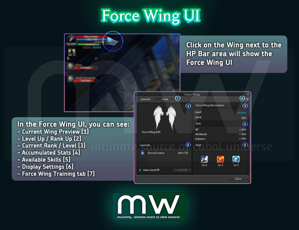 - By clicking on the “Force Wing” badge at the HP Bar area, the Force Wing UI will be displayed.