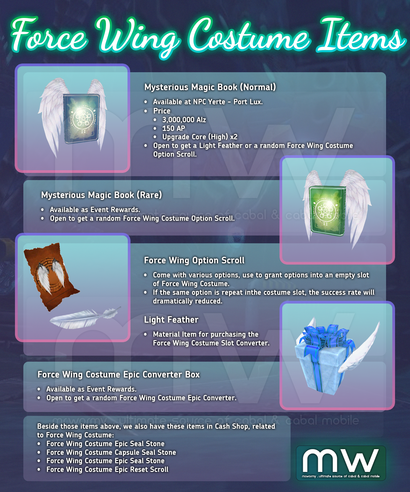 - Force Wing Costume is cash-item that you can get from Cabal Cash Shop (or in some event, depends on publishers). Force Wing Costume is upgradeable in 2 ways by adding Slot Option or Epic Option. There is a handful amount of items were designed to support the Force Wing Costume.