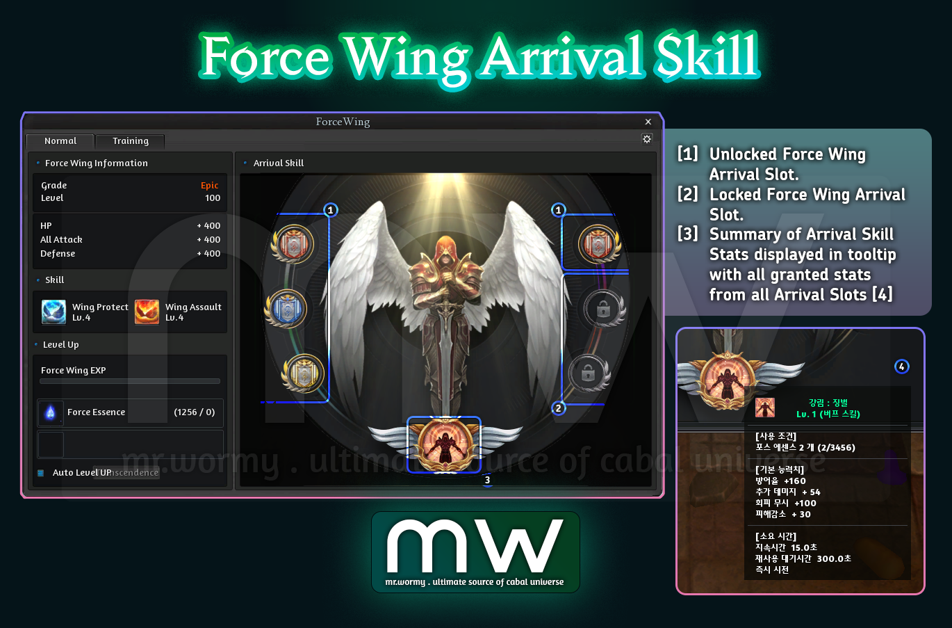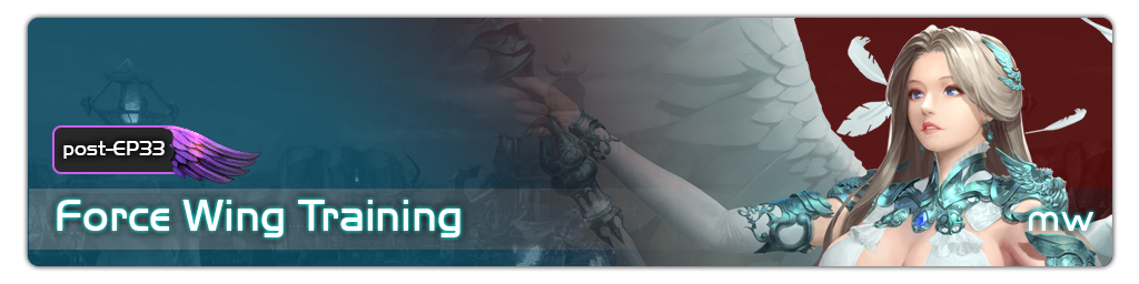 Force Wing was introduced from Episode 22 along with the introduction of Ultimate-grade items. Force Wing is considered as a game-changing factor, which provides a long-term grinding content for players with up to 600 levels were planned. Force Wing opens a whole new chapter for character-growing with many sub-contents such as Force Wing Training, Force Wing Transcendence, Force Wing Dungeon, Force Wing Costume, Force Wing Arrival Skill and more! This page will go through every single aspect of Force Wing eco-system.
