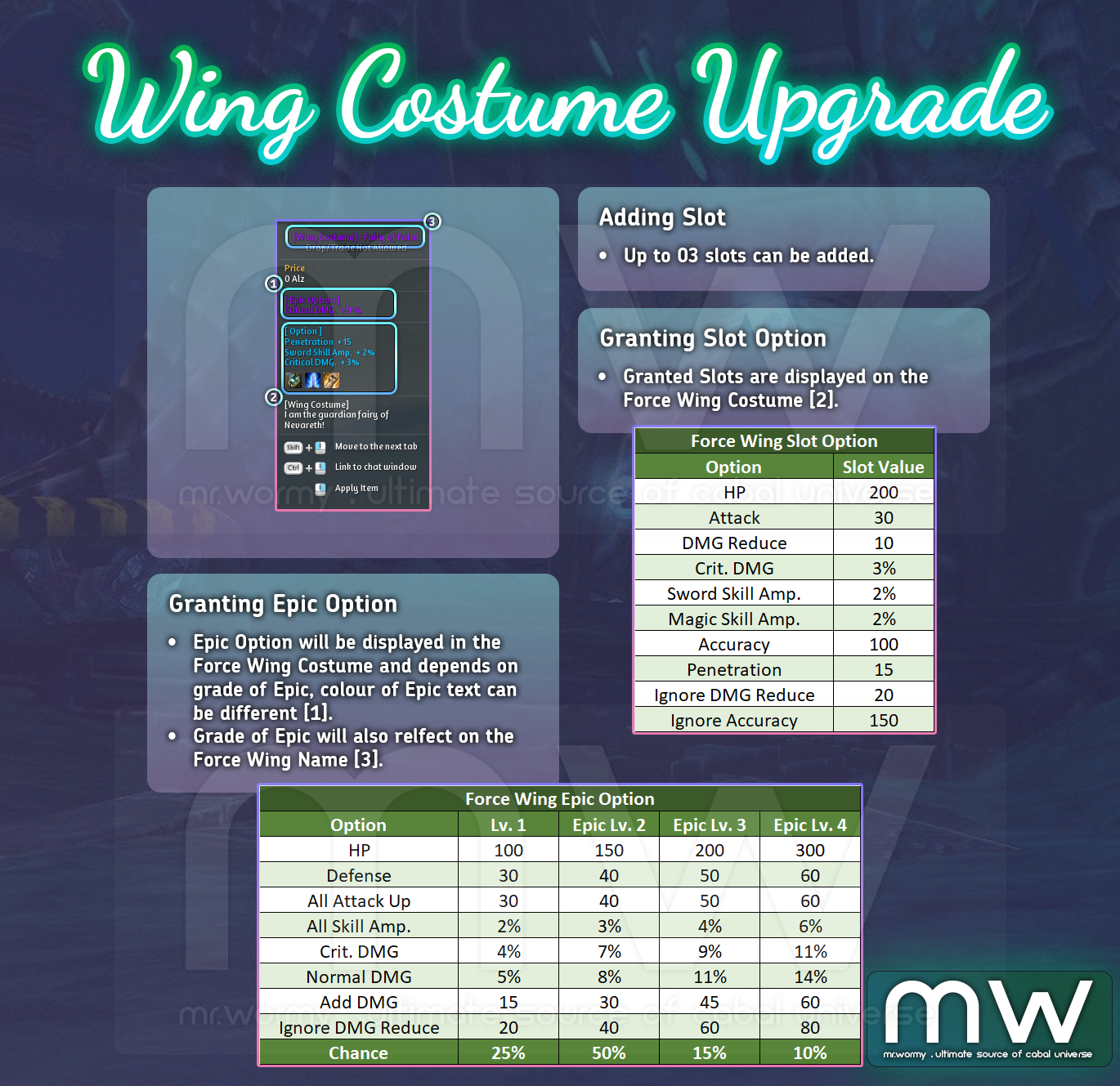 - Success Rate of granting the slot option depends on if the same option is existed in the Force Wing Costume or not, if yes, the success rate will be dramatically decreased.