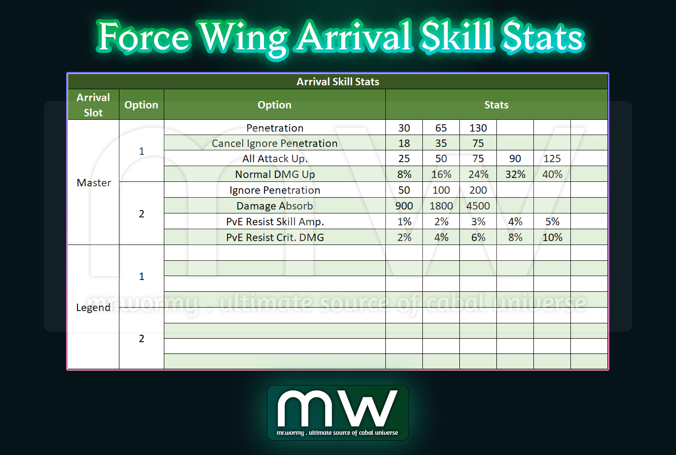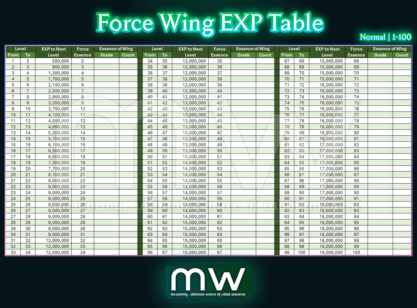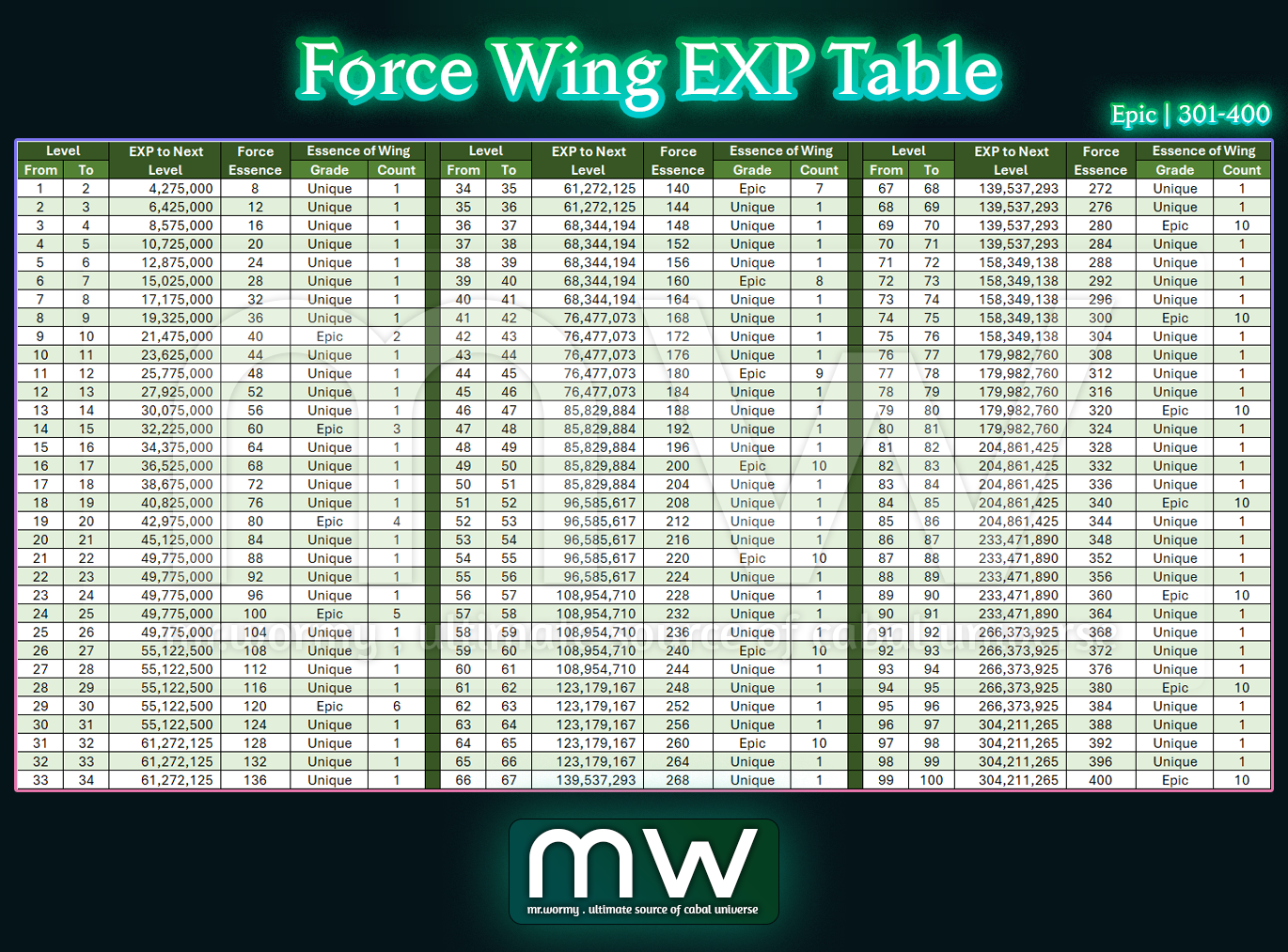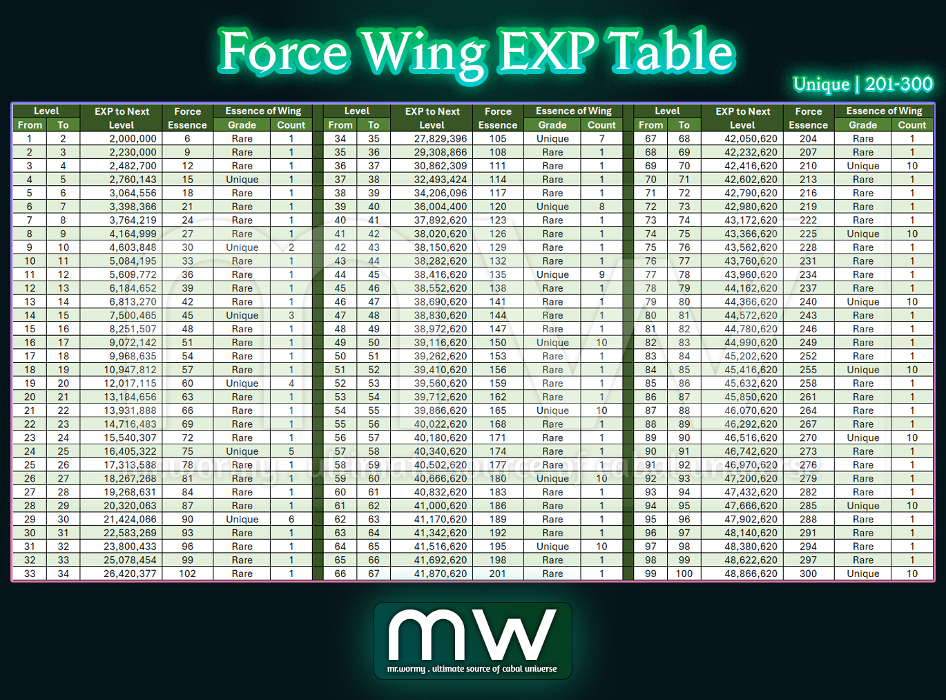Force Wing EXP Table – Legend | 501 – 600