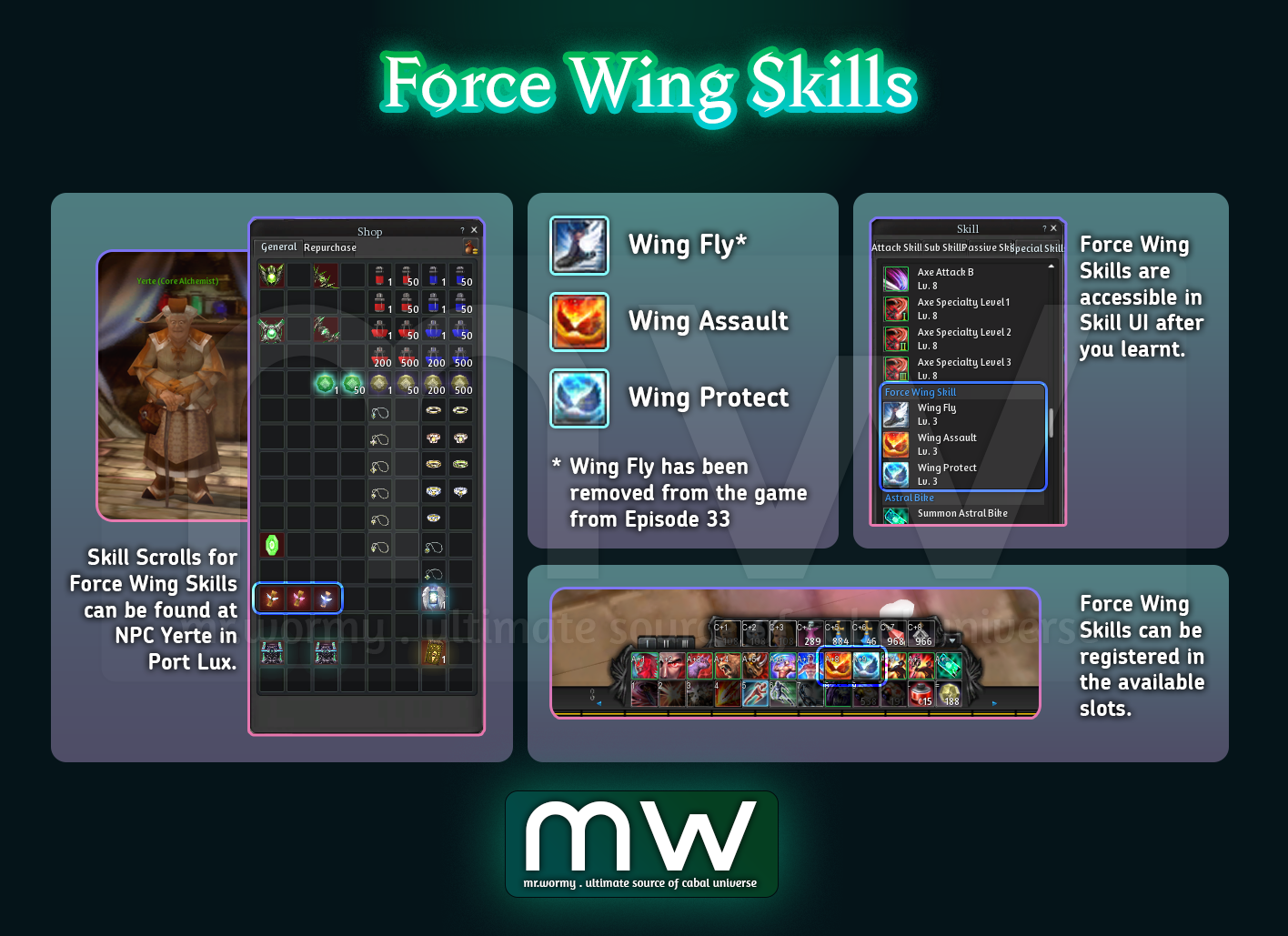- Be noted that, during the Force Wing Renewal in Episode 33, the skill “Wing Fly” is removed.