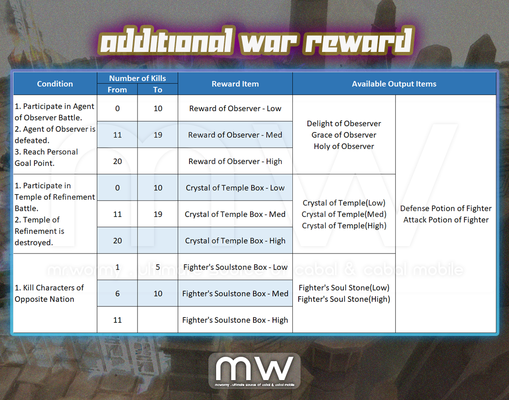 - If a character participated the Temple of Refinement Battle, Temple of Refinement is destroyed, character will get 01 reward. This can be repeat.
