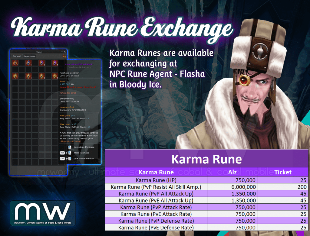 - You need “Karma Rune Exchange Ticket” for exchanging to Karma Rune. Karma Runes are available at NPC Rune Agent – Flasha in Bloody Ice.