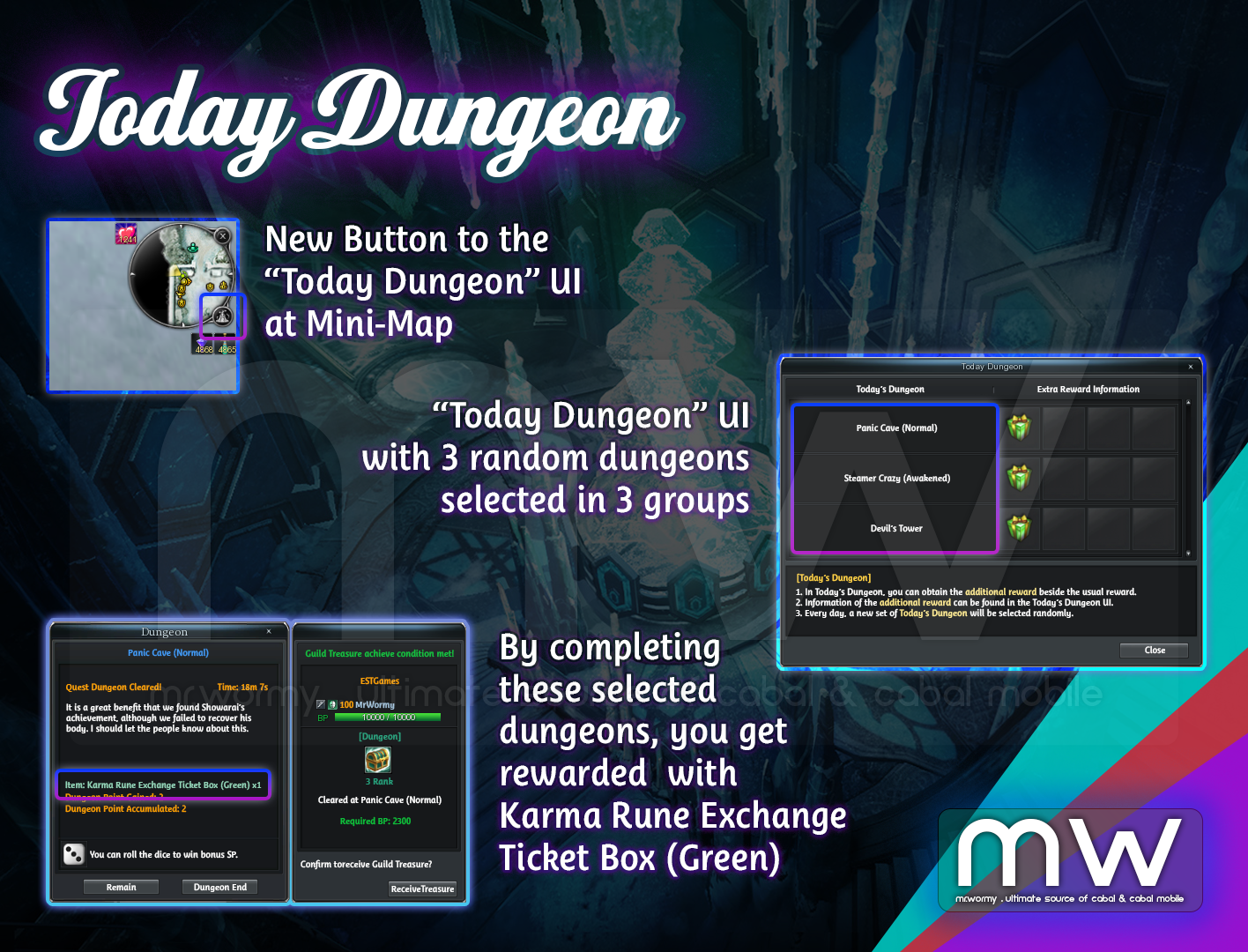 - Karma Rune Exchange Ticket can be obtained as reward of “Today’s Dungeon” feature.