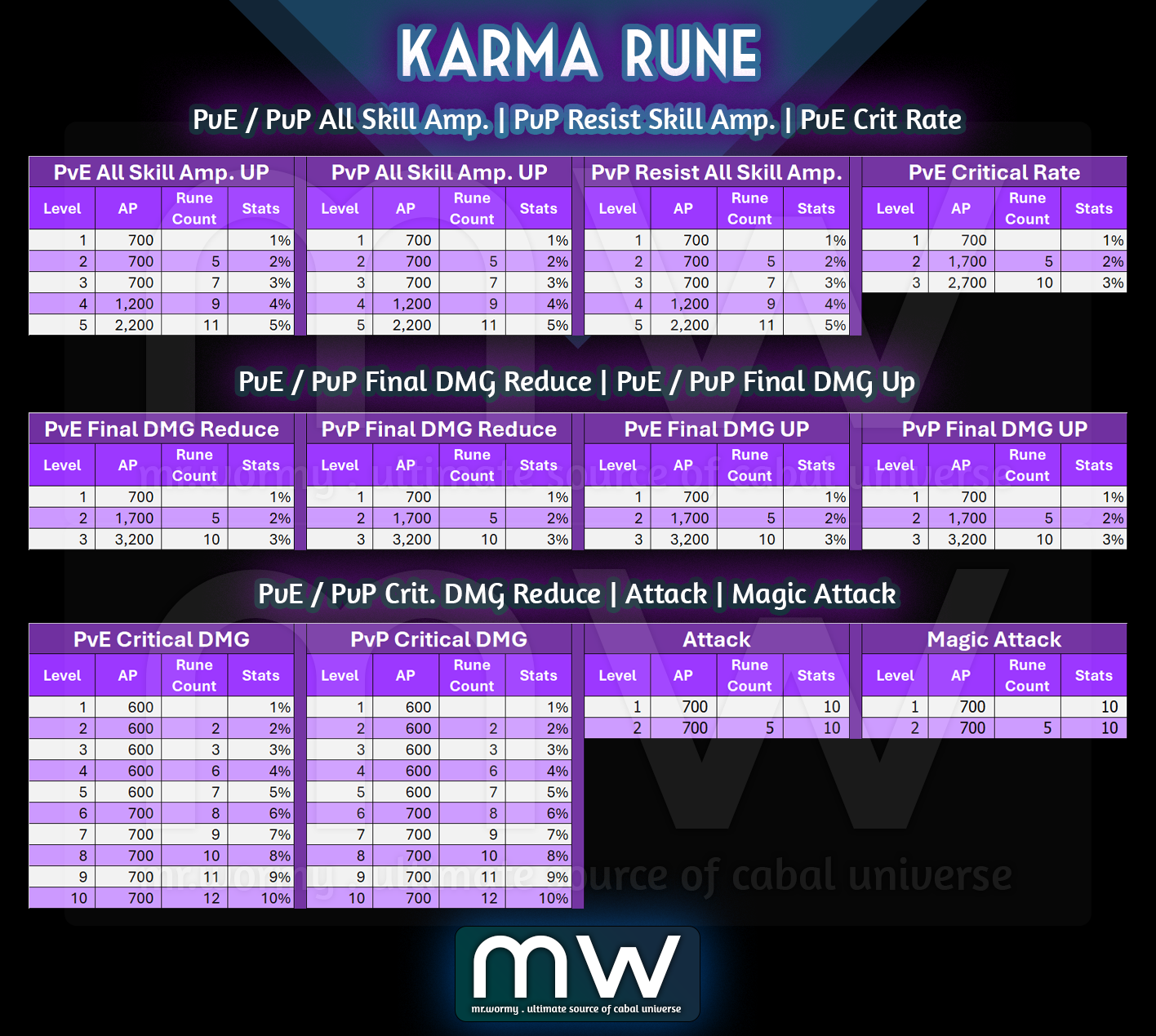 - Add 04 new types of Karma Runes (PvP/PvE Attack Rate & PvP/PvE Defense Rate).