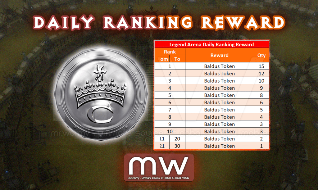 - Daily Ranking Reward: Based on daily ranking, character will be rewarded with Baldus Token, which can be used for purchasing items in “Arena Shop” at NPC Guard Sebius.