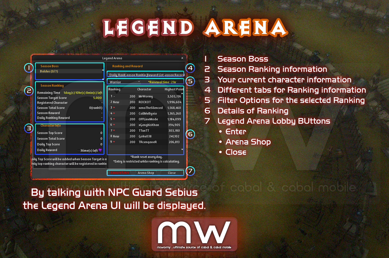 - By talking with NPC Guard Sebius, the Legend Arena Lobby UI will be displayed.