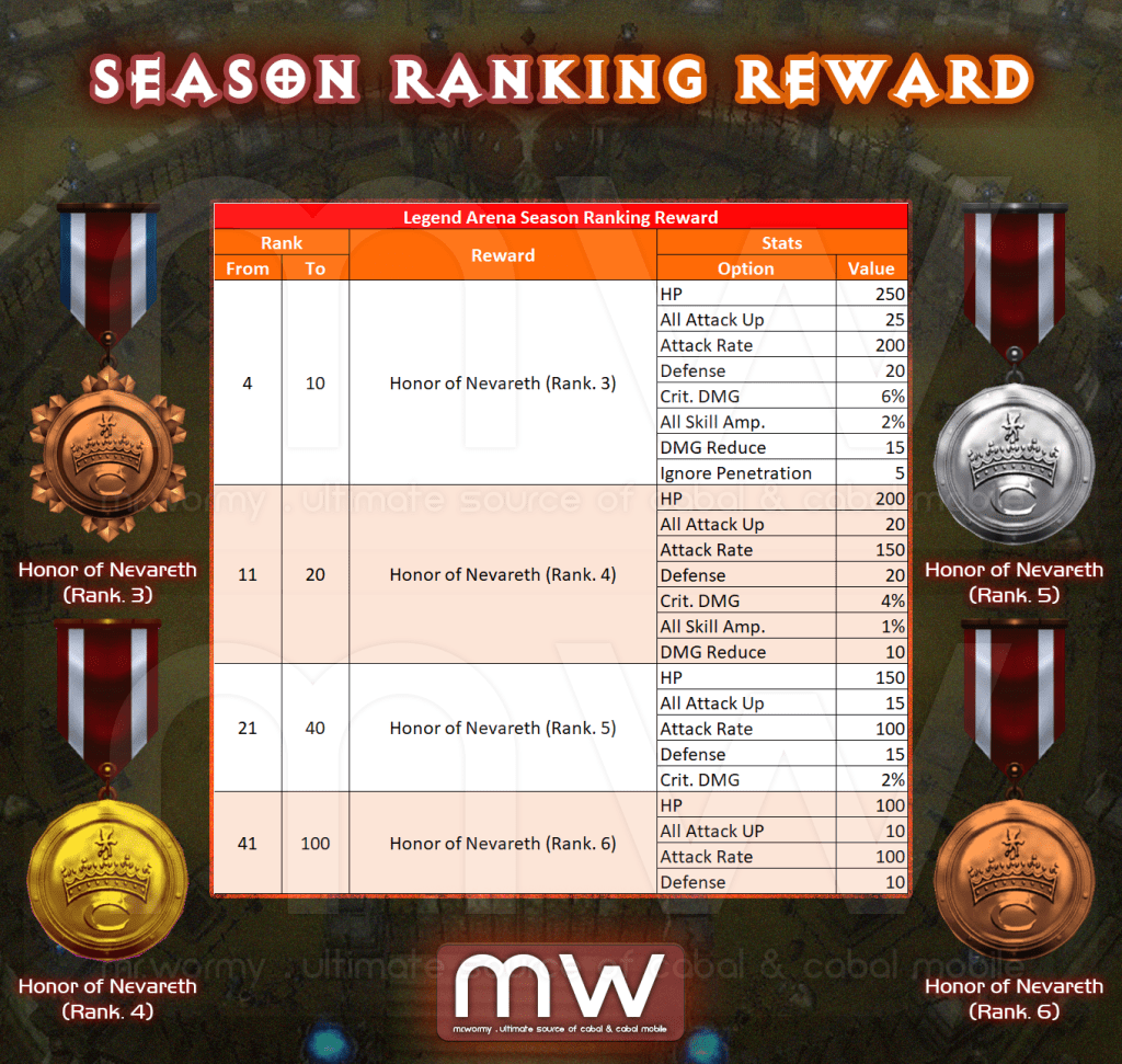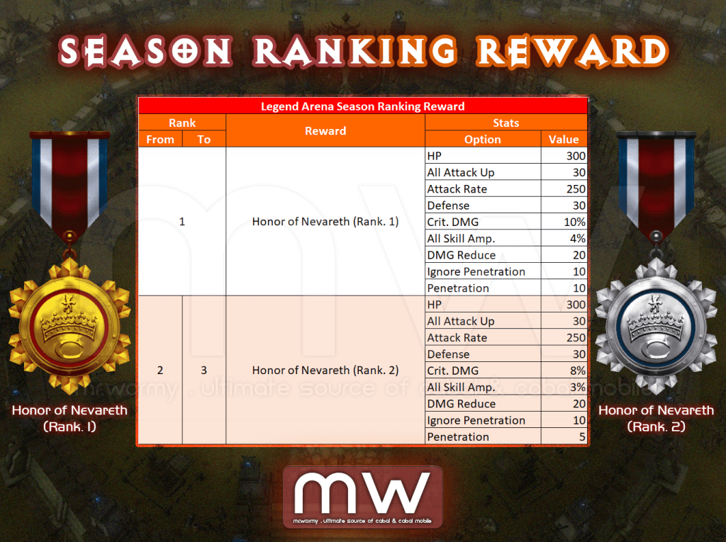 - Season Ranking Reward (Weekly): Based on Season Ranking, character will be rewarded with Honor of Nevareth, a link-weapon that gives additional stats for your character. The Honor of Nevareth comes with 06 different ranks, with different stats.