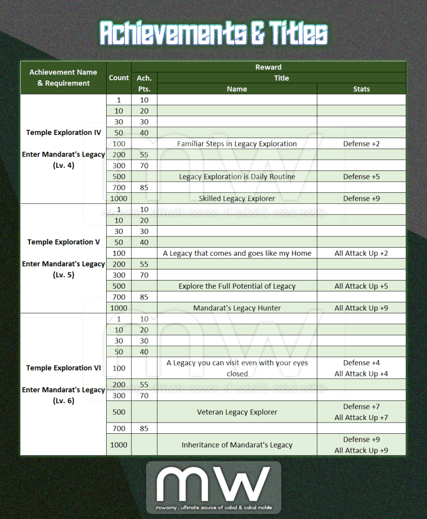 - Different Achievements & Titles will be granted related to Mandarat’s Legacy Dungeons.