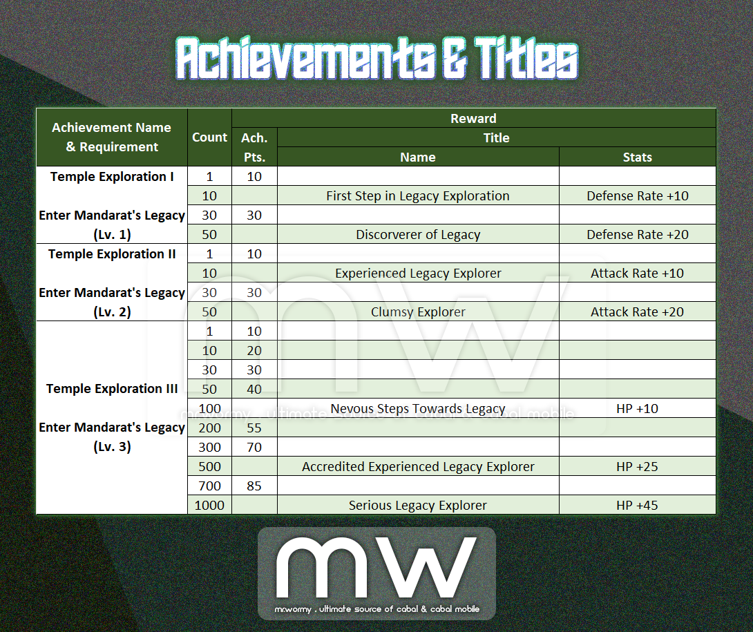 - Different Achievements & Titles will be granted related to Mandarat’s Legacy Dungeons.