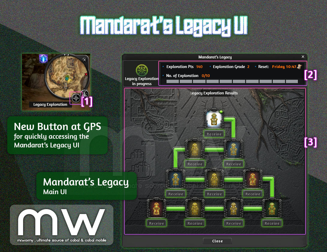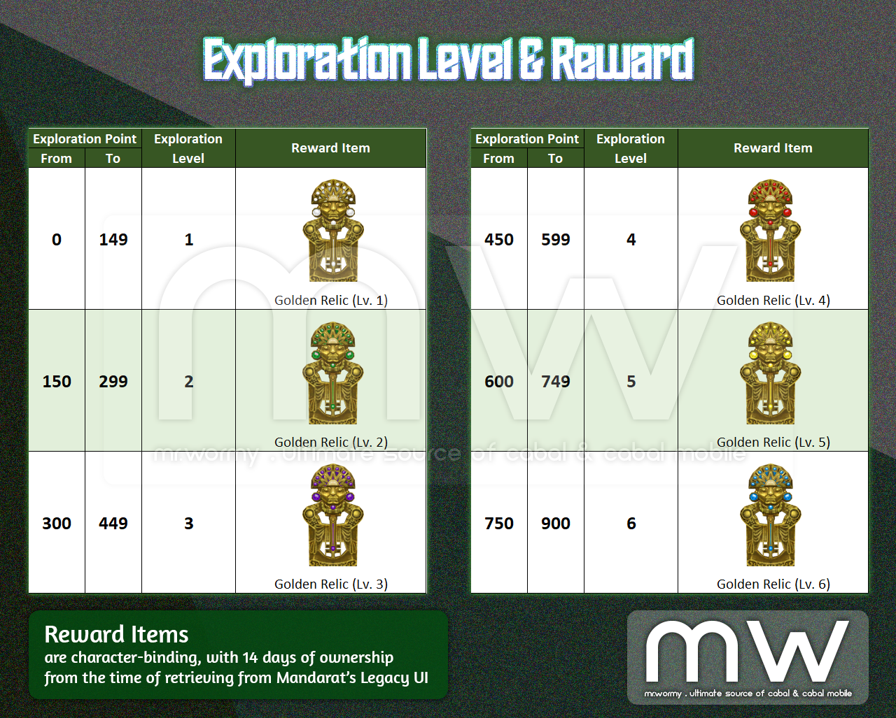 - For every 10x Explorations, a reward slot will be granted in the “Mandarat’s Legacy” UI.