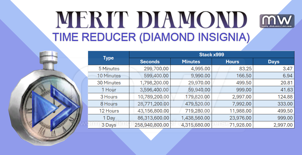 - Time Reducer (Platinum Insignia) cannot be used for speeding up the opening process of Diamond Insignia.