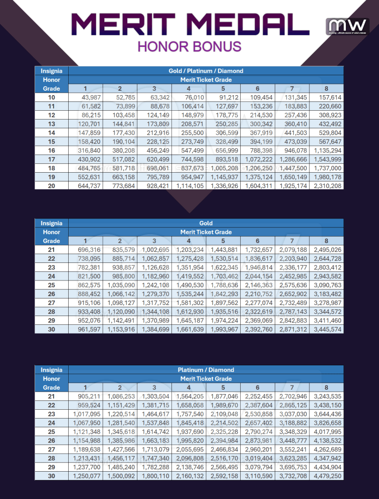 - Amount of Honor Point obtained by reporting Merit Medal is based on the type of current Insignia and target character Honor Grade.