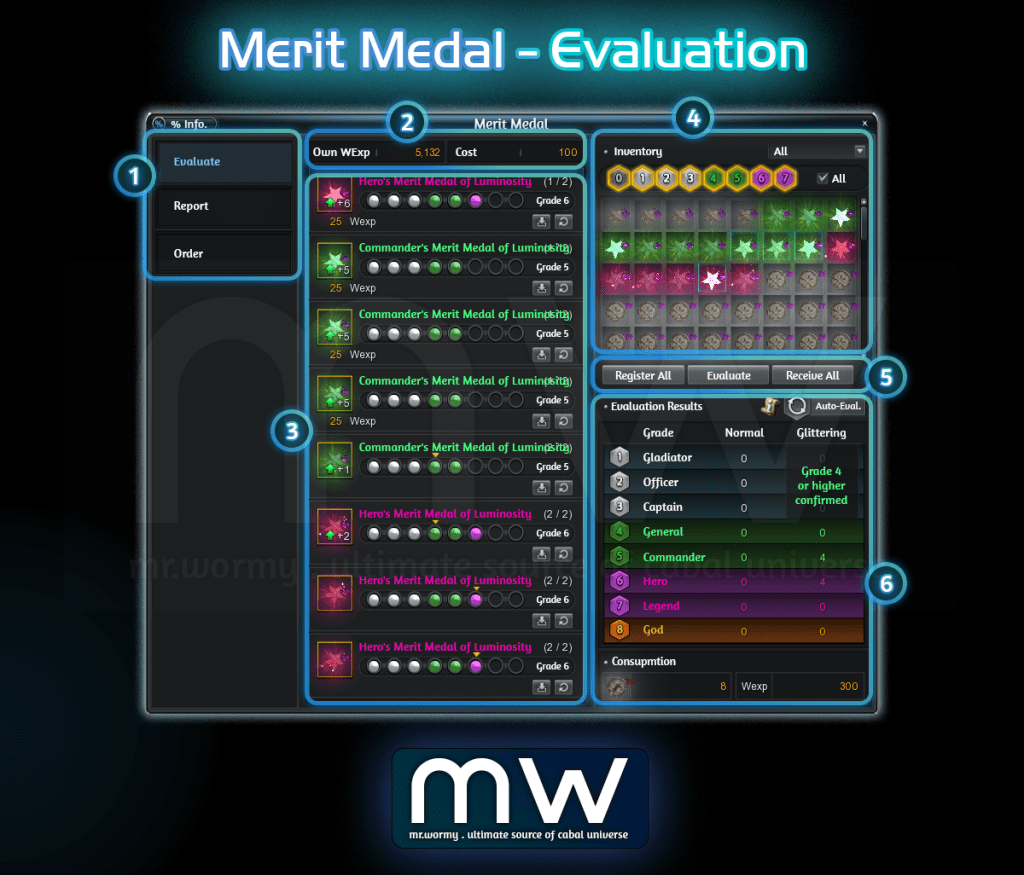 - [6] As the evaluation requires WEXP, the details of WEXP that character has and the required WEXP for evaluation will be displayed.