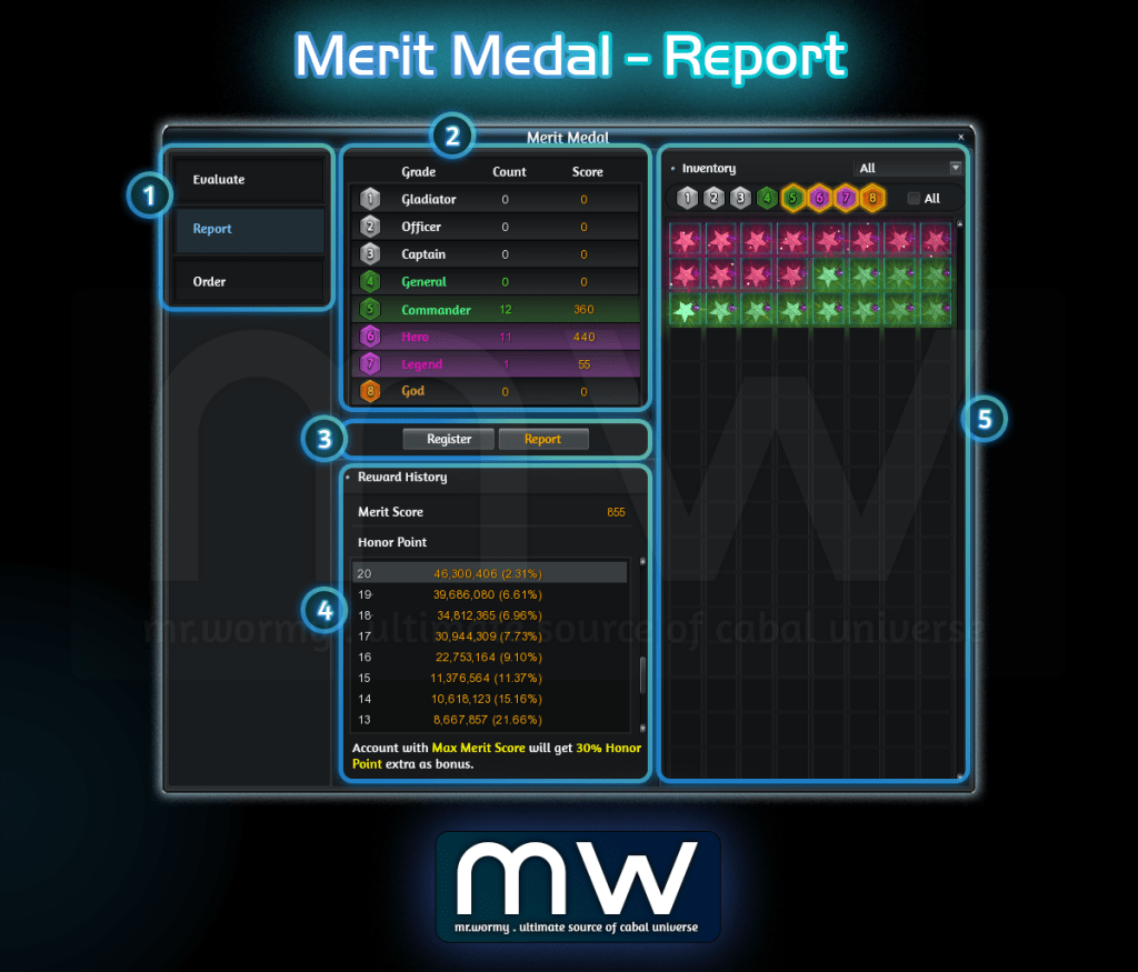 - [5] Once the evaluation is completed, player can report the evaluated medals at NPCs to obtain Merit Score and if player’s Honor Rank is higher than Rank 10, additionally Honor Point will be granted.