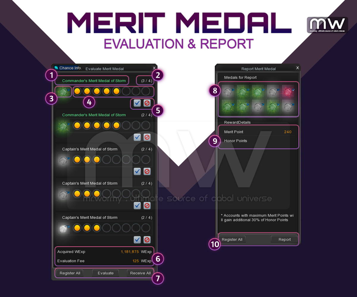 - [5] Once the evaluation is completed, player can report the evaluated medals at NPCs to obtain Merit Score and if player’s Honor Rank is higher than Rank 10, additionally Honor Point will be granted.