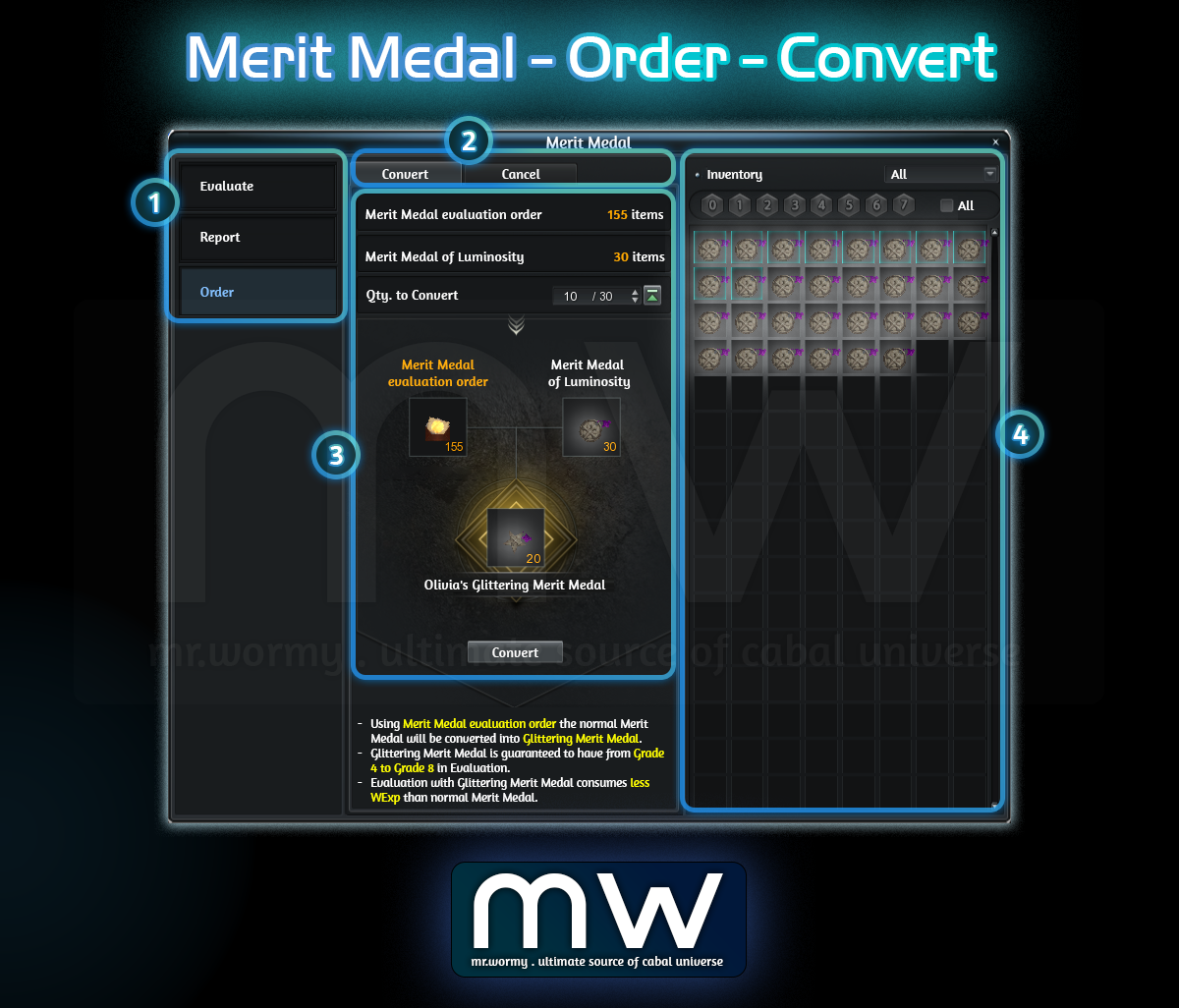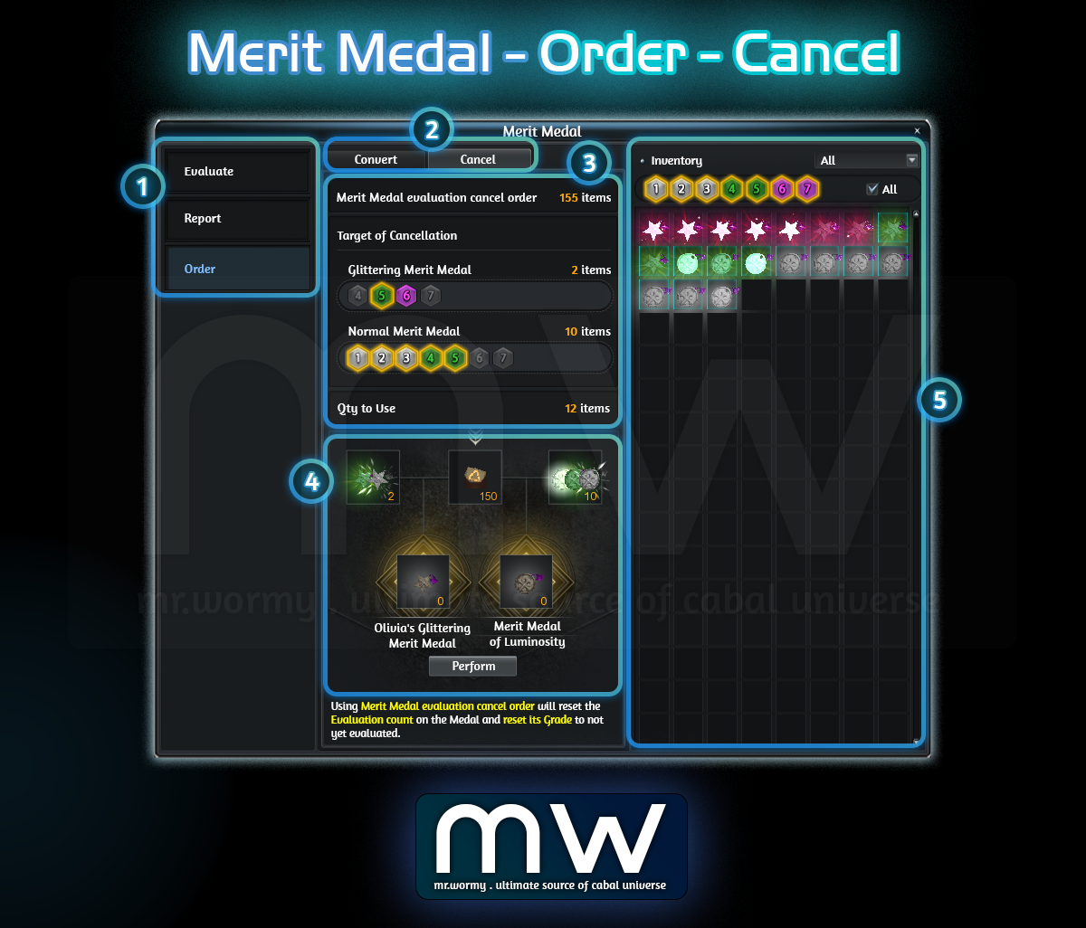 - Cancel: For using “Merit Medal evaluation cancel order”