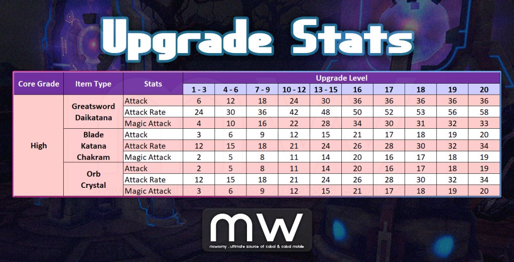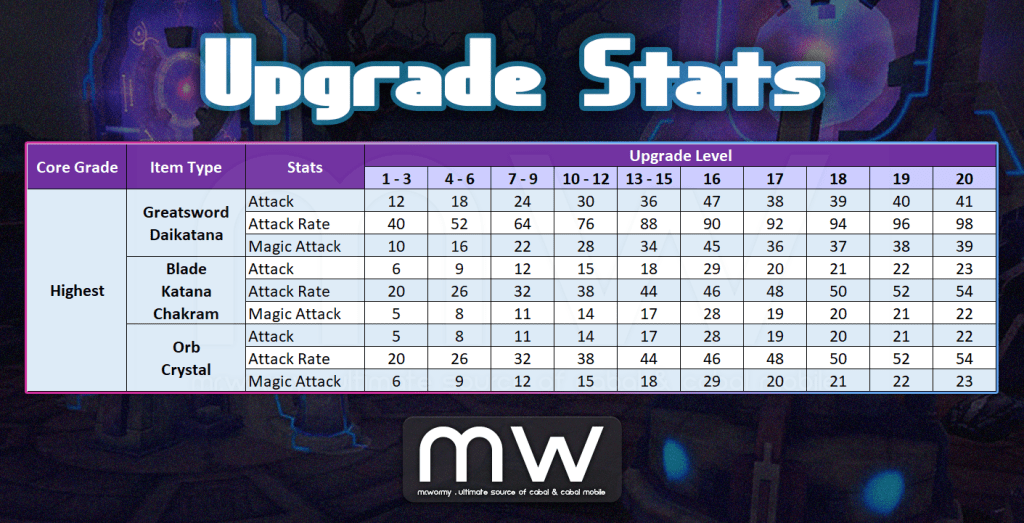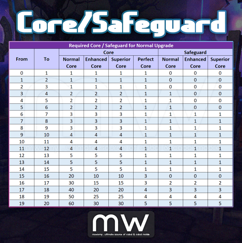 - Each upgrade level requires a different amount of core for performing the upgrade.