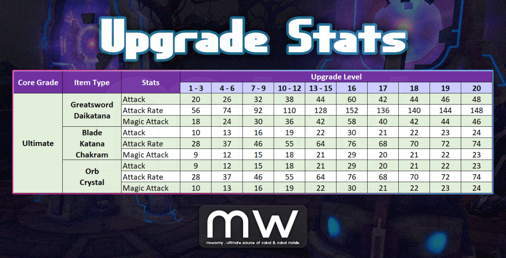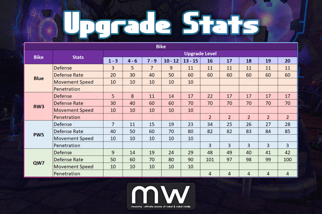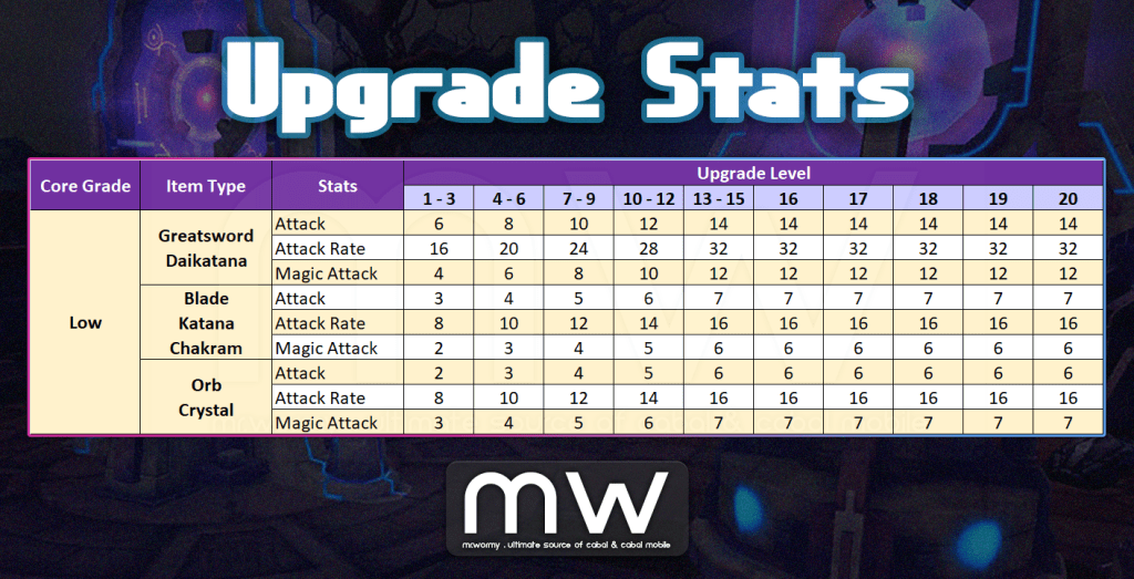 - Normal Upgrade can be performed on all kind of weapons, armor pieces and bikes. Different item grades consume different grade of core and give different amount of stats; however, the success rate is the same for all.