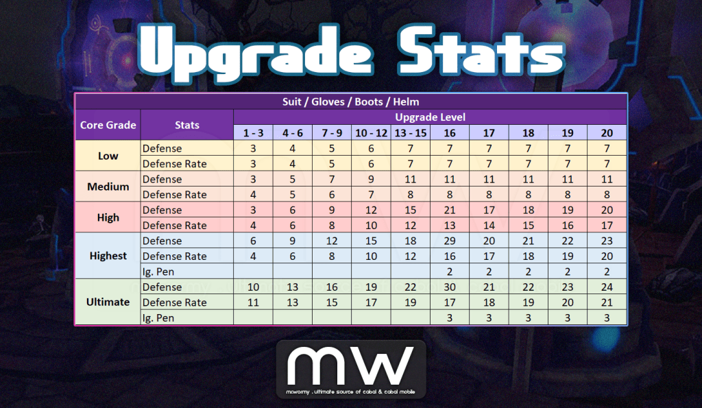 - Armor Item Stats (Suit / Gloves / Boots / Helm) for all Item Grades: