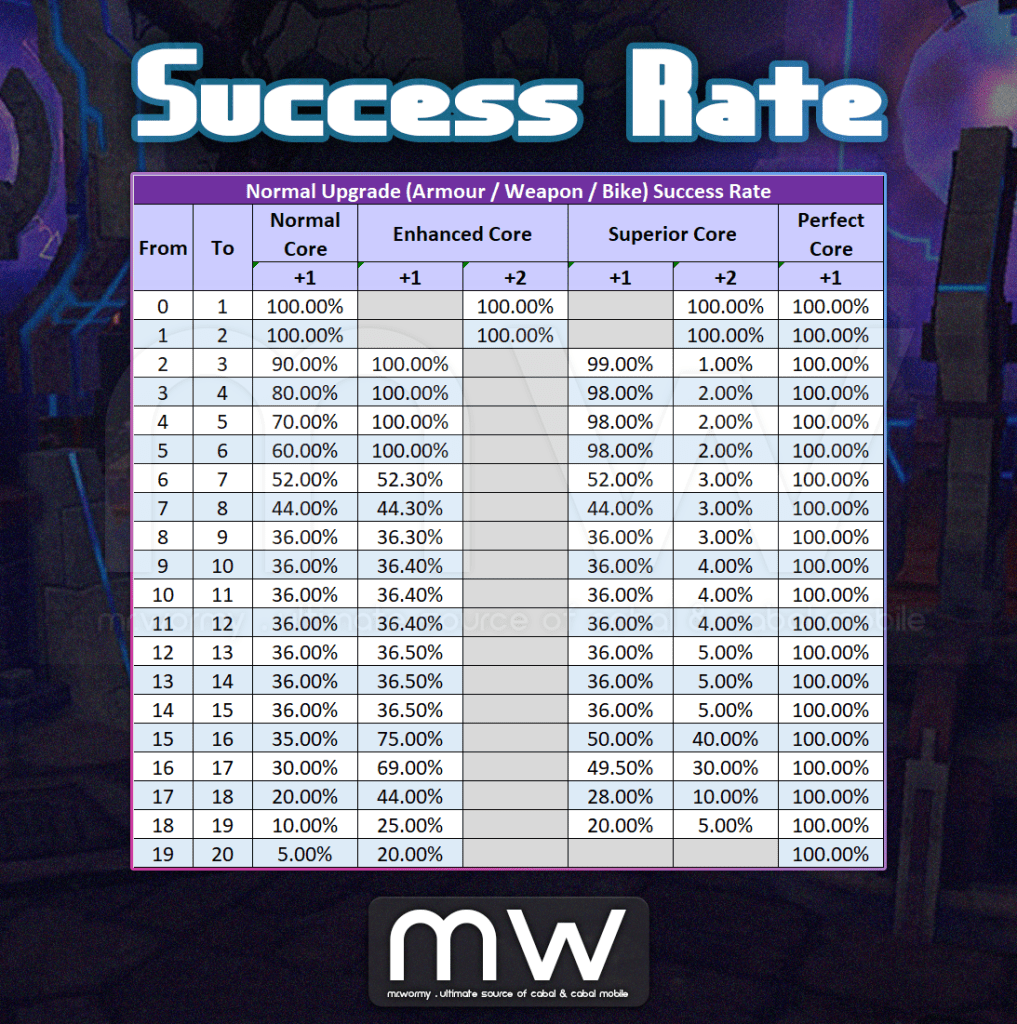 - The detailed success and failure rate for Normal / Enhanced / Superior Core can be found below.