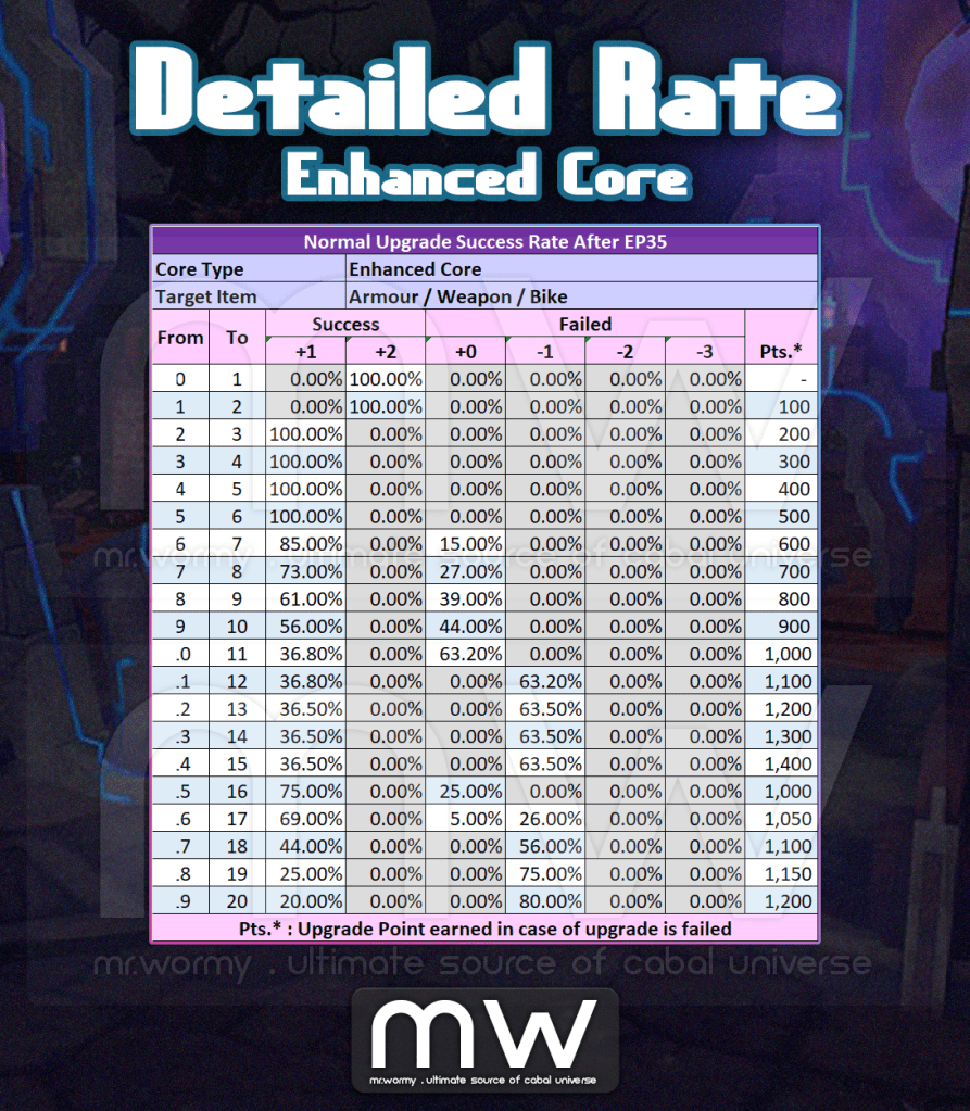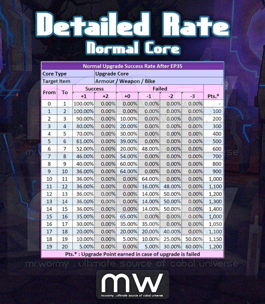 - The Normal Upgrade gets some changes in Episode 35 with Success Rate, Core Consumption and some other changes; therefore, the details of Normal Upgrade results are separated into 2 different section: