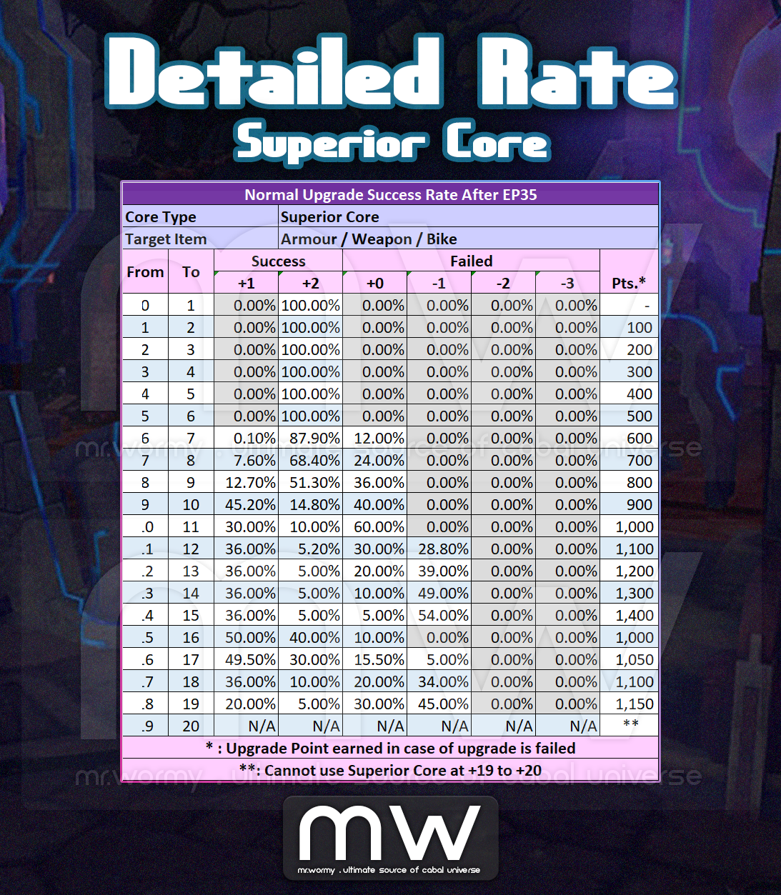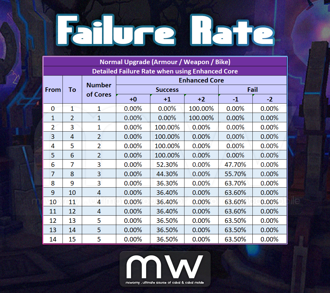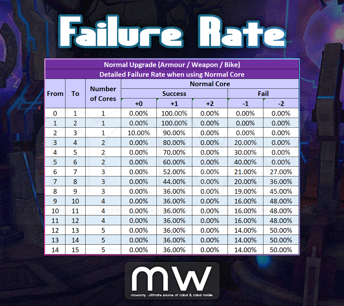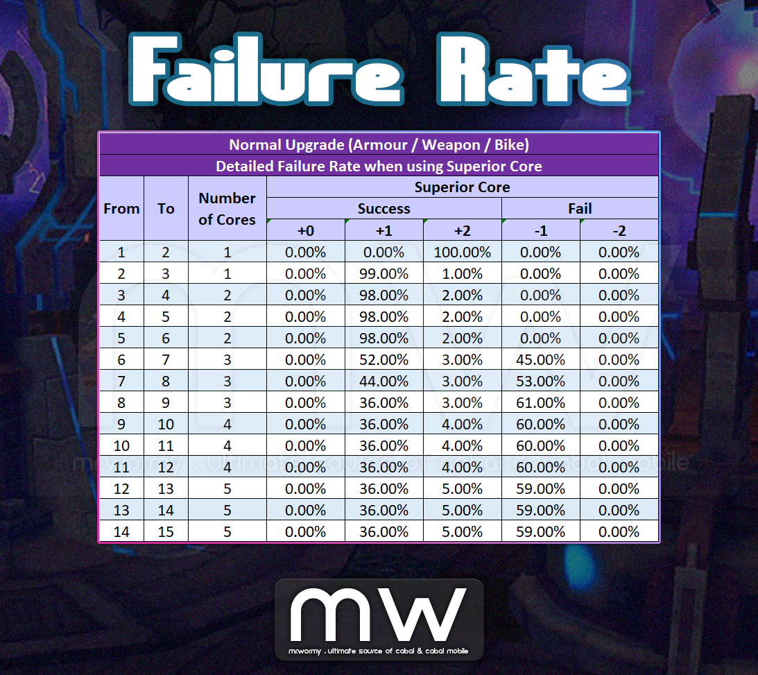 - The detailed success and failure rate for Normal / Enhanced / Superior Core can be found below.