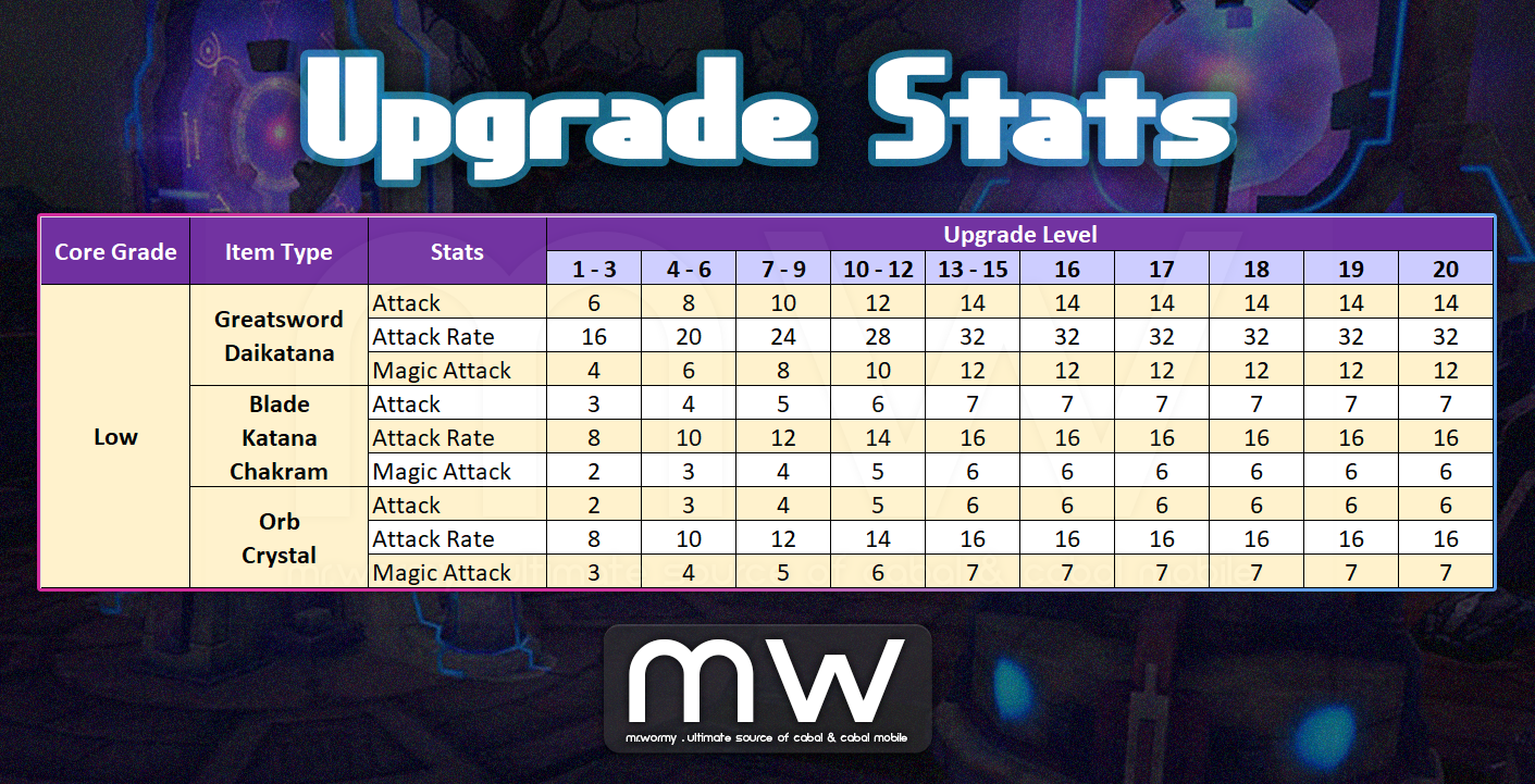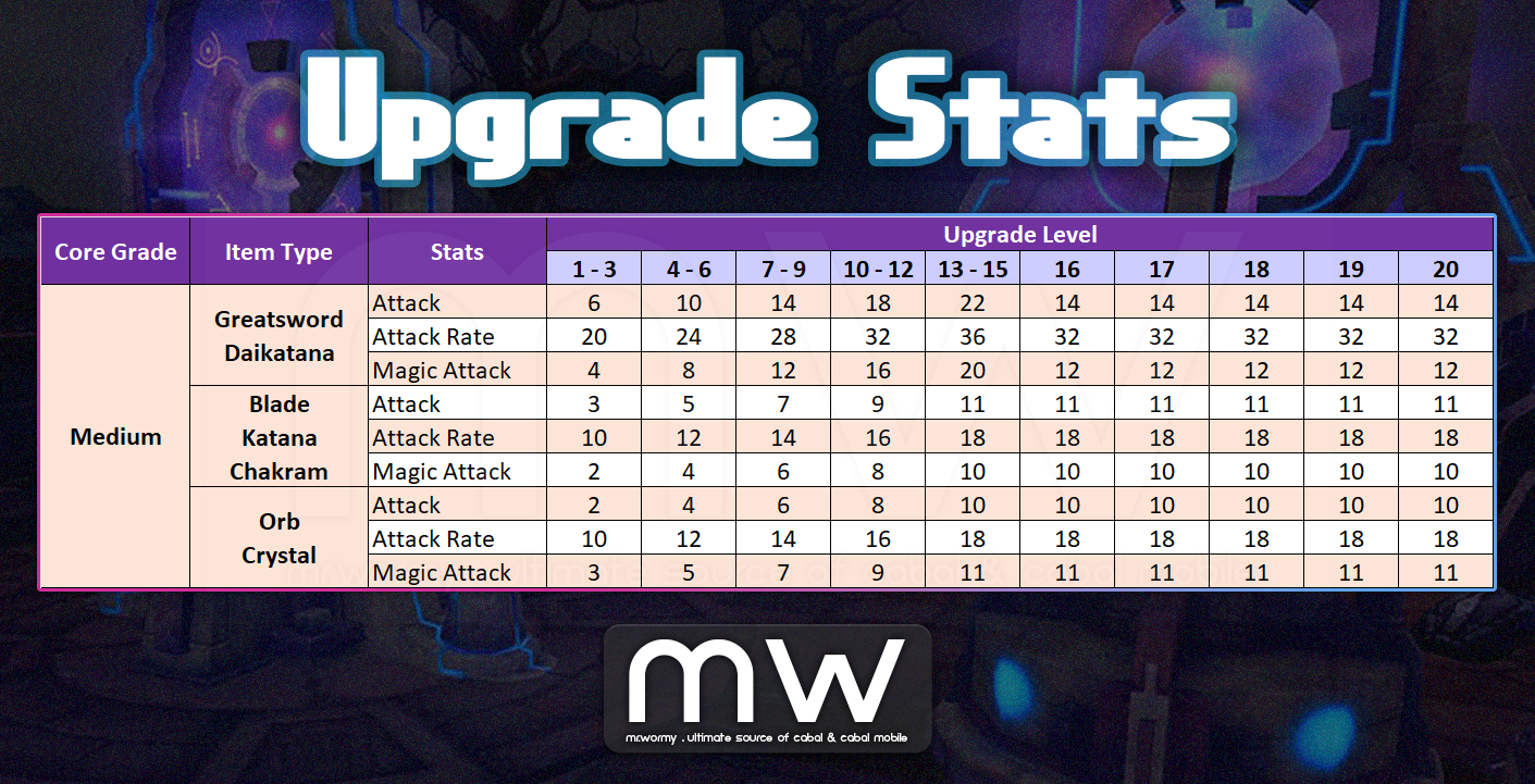 - Each upgrade level requires a different amount of core for performing the upgrade.